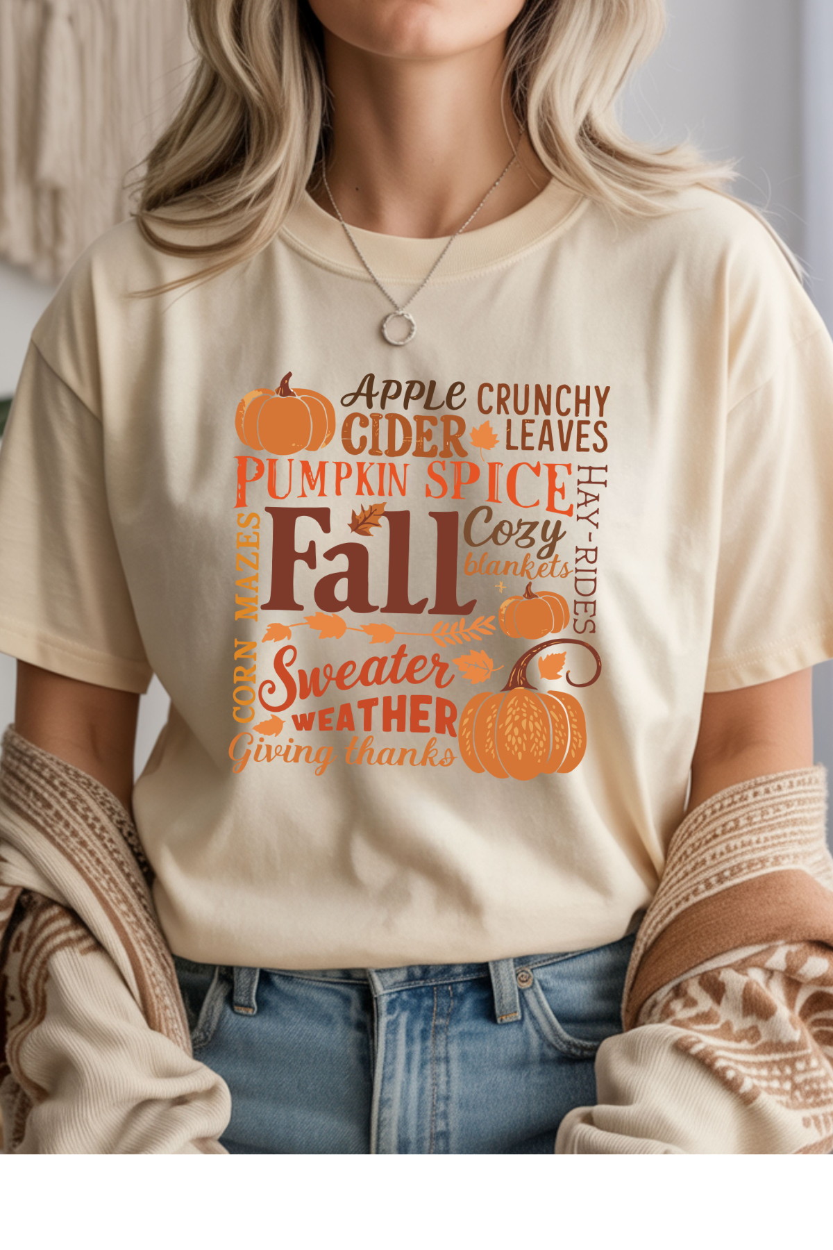 Cozy up to autumn with the Words of Fall Graphic Tee! This playful tee features charming seasonal phrases that bring all the warm, fuzzy feelings of fall to your wardrobe. Perfect for crisp walks, pumpkin spice moments, or just showing off your love for the season in a fun, comfy way.