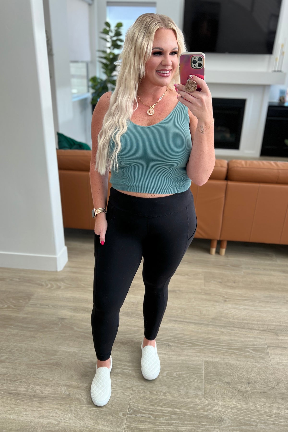Keep it movin and groovin in style with the Keep It Moving Leggings! Complete with a high waist to emphasize support and comfort, side pockets to hold the essentials, and a skinny ankle length silhouette for the perfect coverage and fit. The fun seam detail is just another reason why we love these timeless leggings. Pair with a sports bra and your fav sneakers for a cute and classic look.