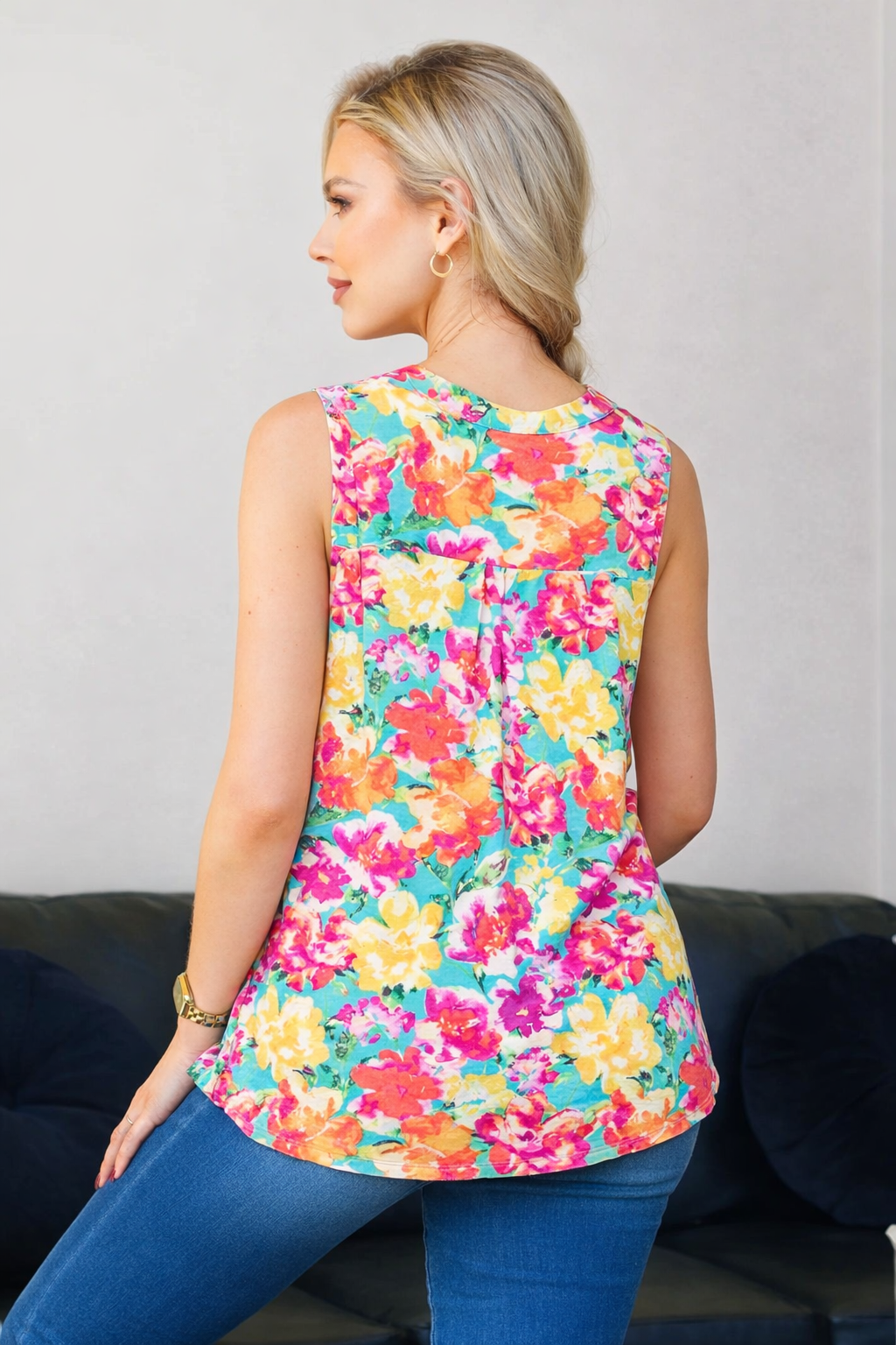 Petals of the Earth Tank is bursting with color and effortless charm. Designed with an easy A-line bodice, split neckline, and mandarin collar, this tank offers a flowy, relaxed fit that keeps you cool all season long. The non-sheer, stretchy, wrinkle-free fabric makes it as practical as it is vibrant. Style it with denim shorts and sandals for sunny days or pair it with white jeans for a fresh, polished look. 🌸