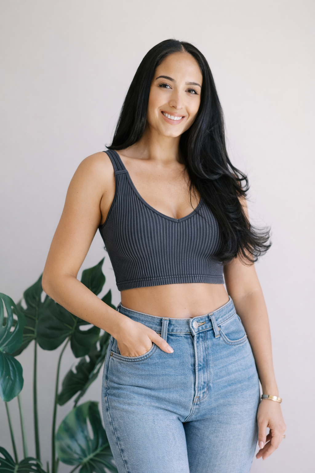 Soft, stretchy, and made to move with you — this washed ribbed crop tank is the effortless essential your closet’s been craving. Designed with a seamless fit and built-in padding for easy, throw-on-and-go support, it hugs in all the right places without feeling tight. Pair it with high-waisted denim, lounge shorts, or layered under your favorite shacket. Cute, comfy, and ready for whatever the day brings.