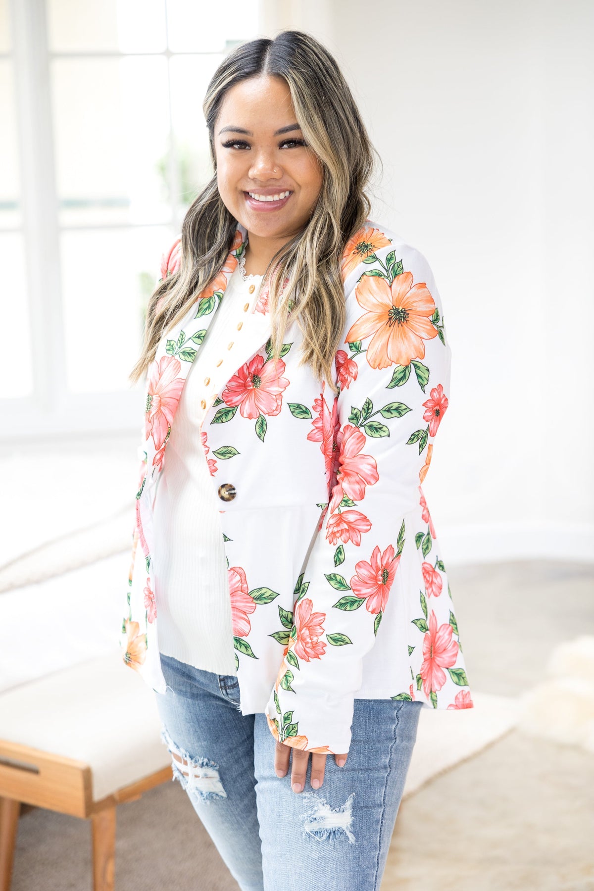 This super stretchy and amazing floral blazer will be one of the beacons in your wardrobe. With a fitted silhouette, this blazer features long sleeves, front button closure and hi-lo hem.