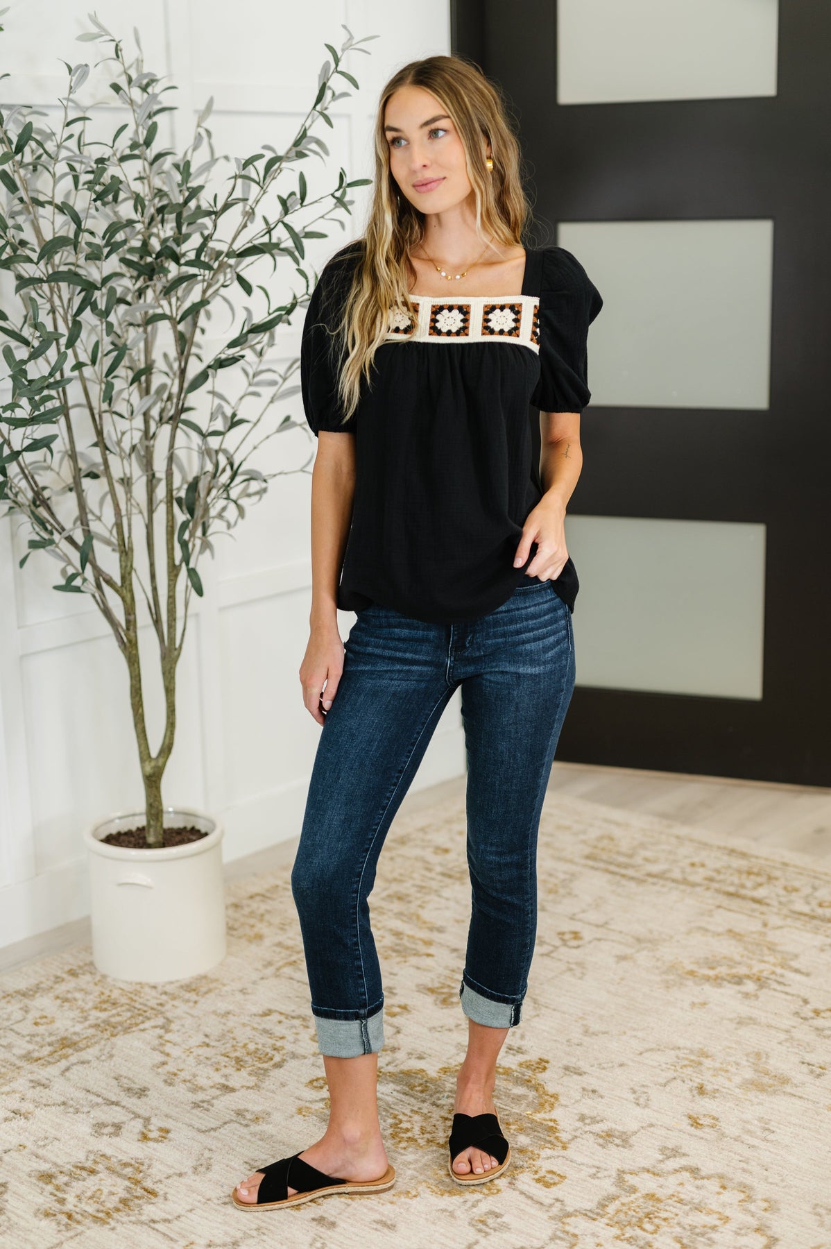Stay cool and stylish with our Craft Night Crochet Detail Top. Made from lightweight gauze, this top features a square neckline and balloon sleeves with cased elastic cuffs. The granny square crochet details add a unique touch, while the functional back tie with bead details adds a playful element. Perfect for a fun night out!