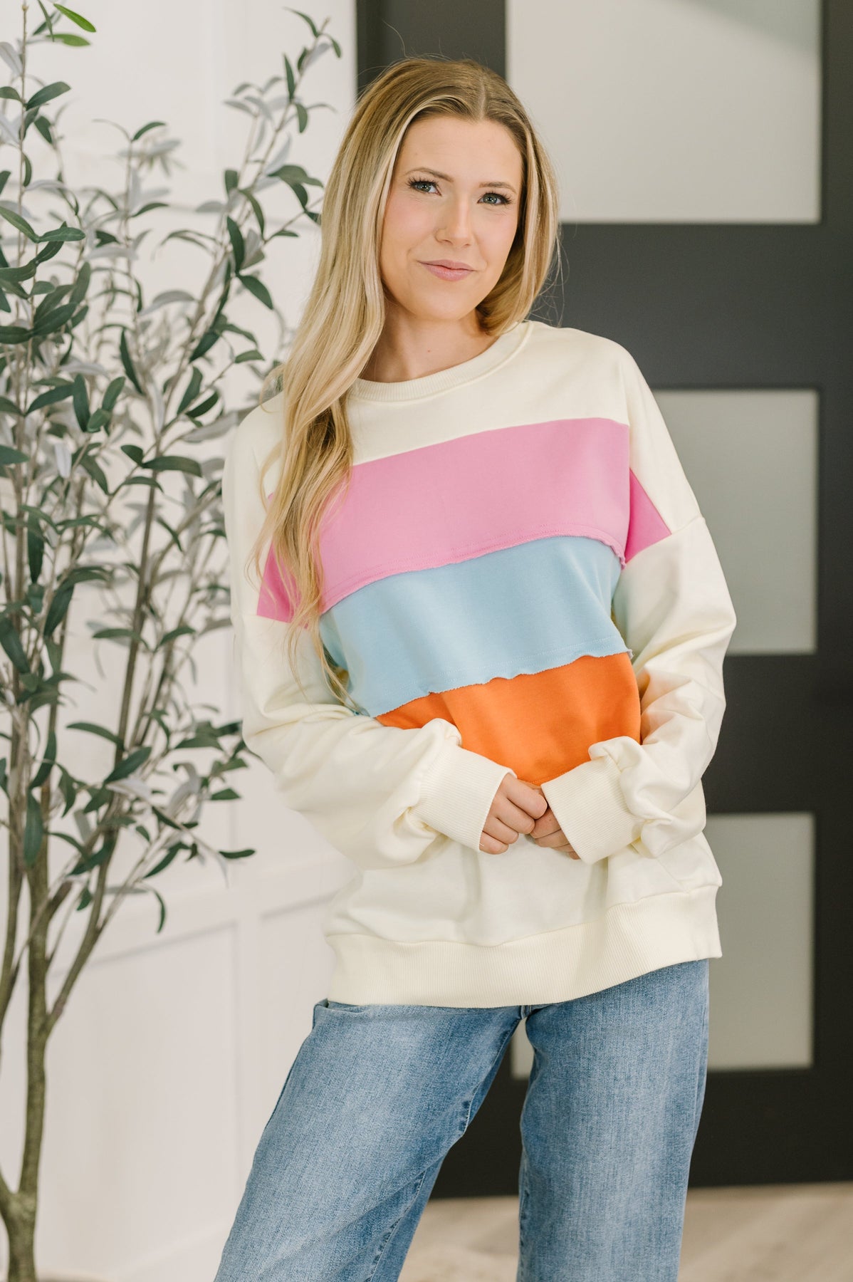 The Humor Me Color Block Relaxed Pullover brings effortless style with its laid-back silhouette and eye-catching design. Crafted from soft French terry, this pullover features a banded ribbed round neckline and drop shoulder cut for that coveted relaxed fit. Bold contrast color blocking makes a statement, while banded ribbed cuffs and hemline keep everything polished. Exposed seam details add an edgy, contemporary touch that elevates your casual wardrobe.