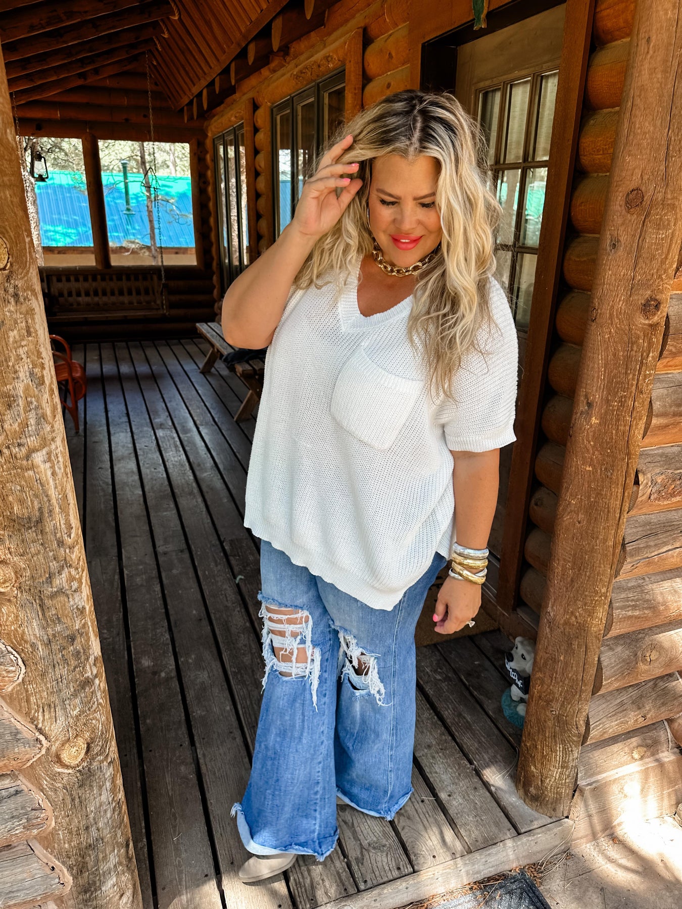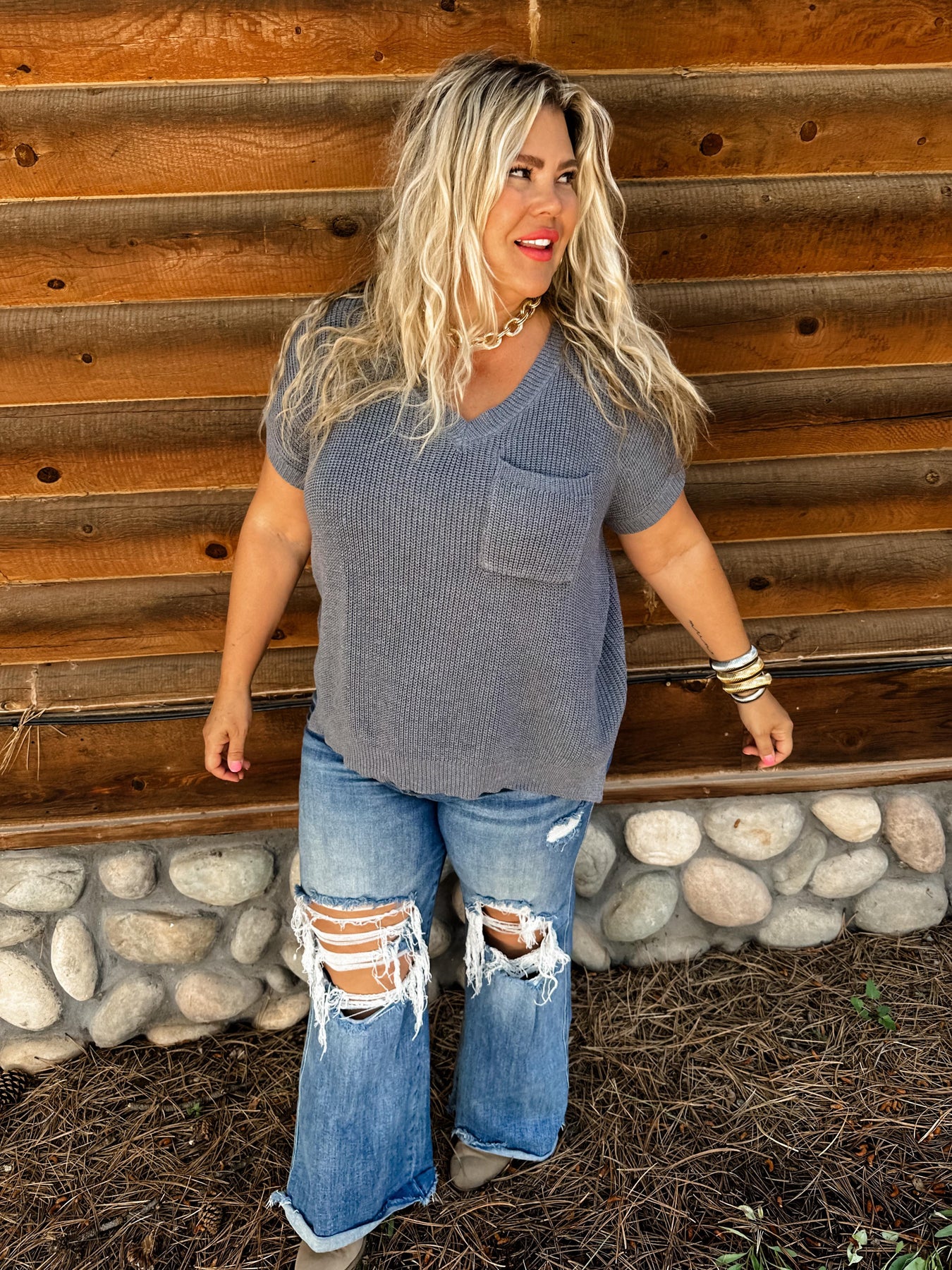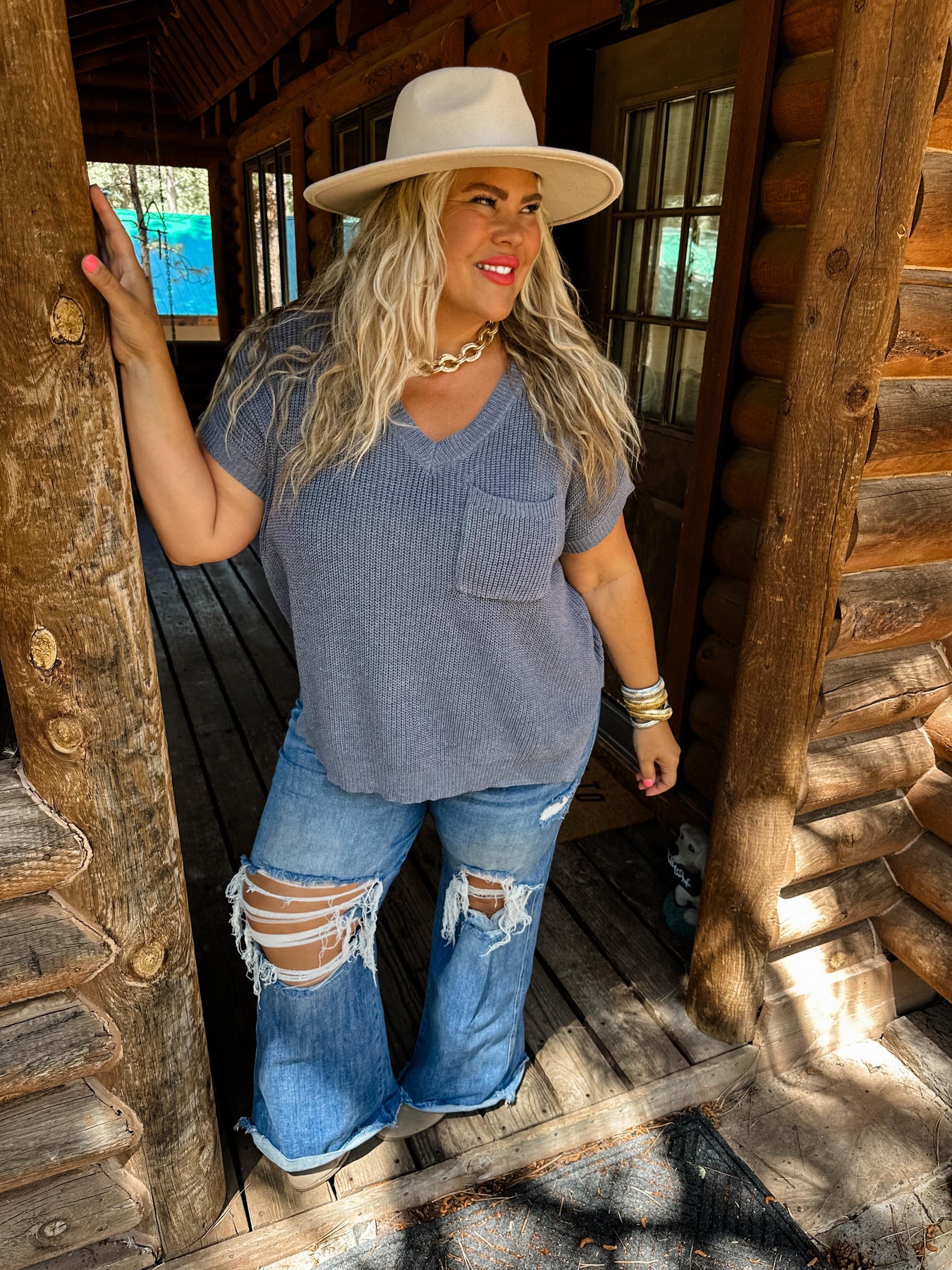 The perfect V-Neck, pocket knit sweater!  So casual, yet so classy!  This is a medium weight knit and perfect for the Fall/Winter transition.
