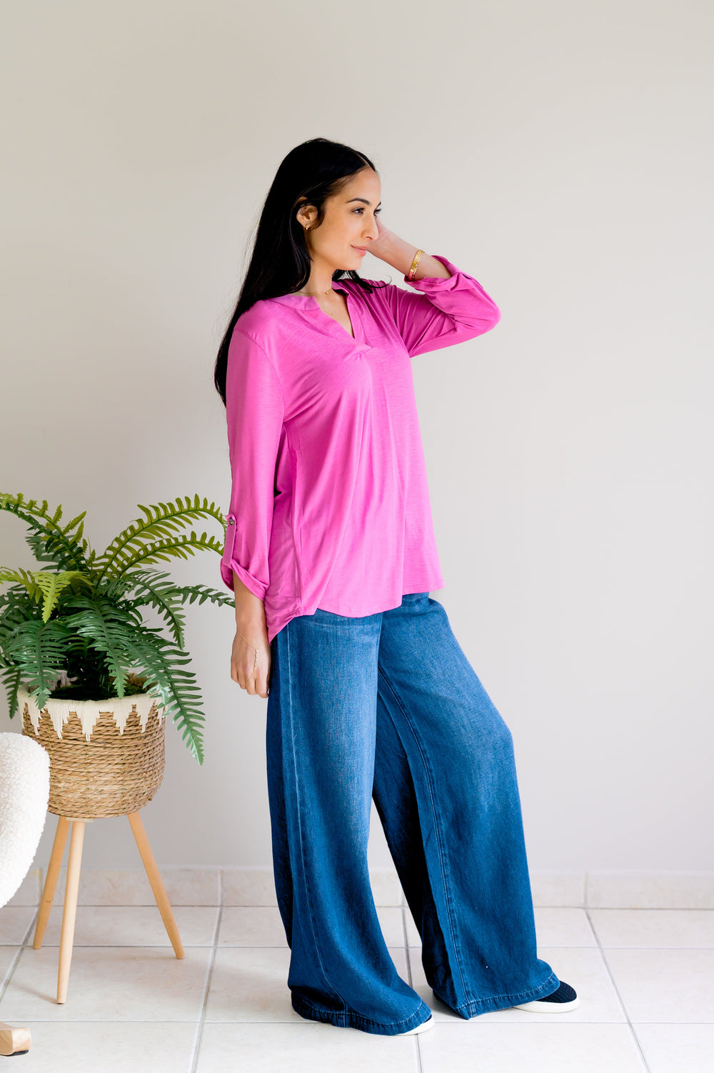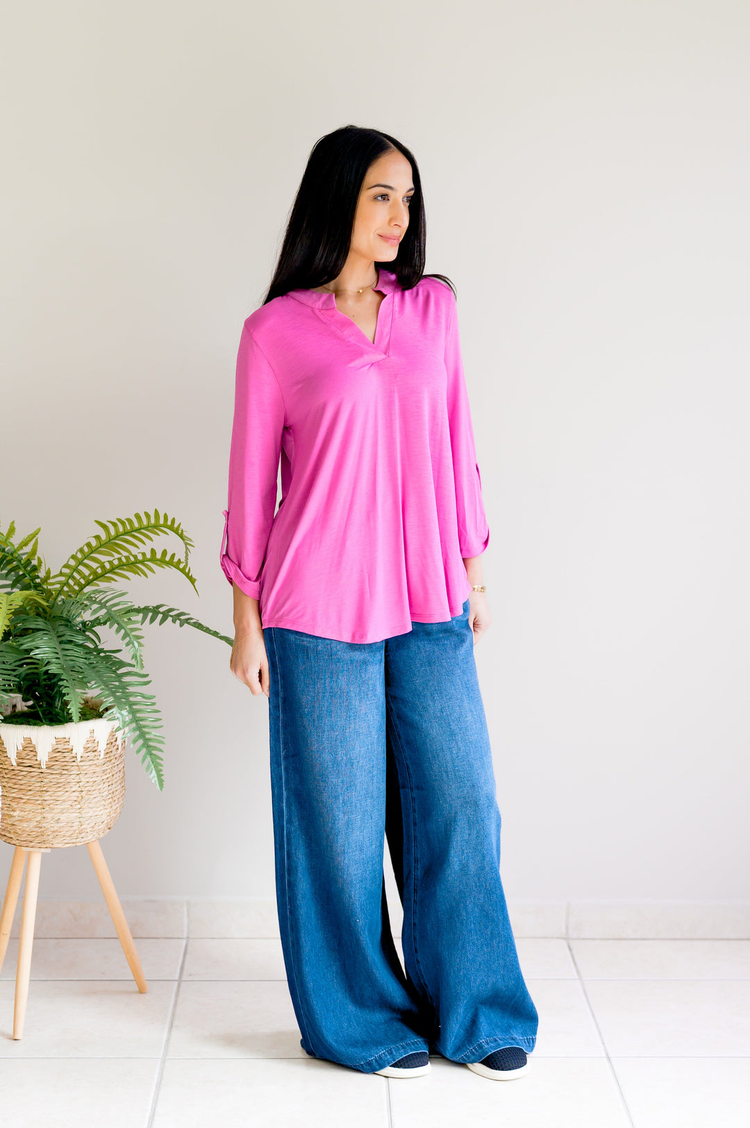 It Starts Here Basic Rolled Sleeve Tee in H Fuchsia