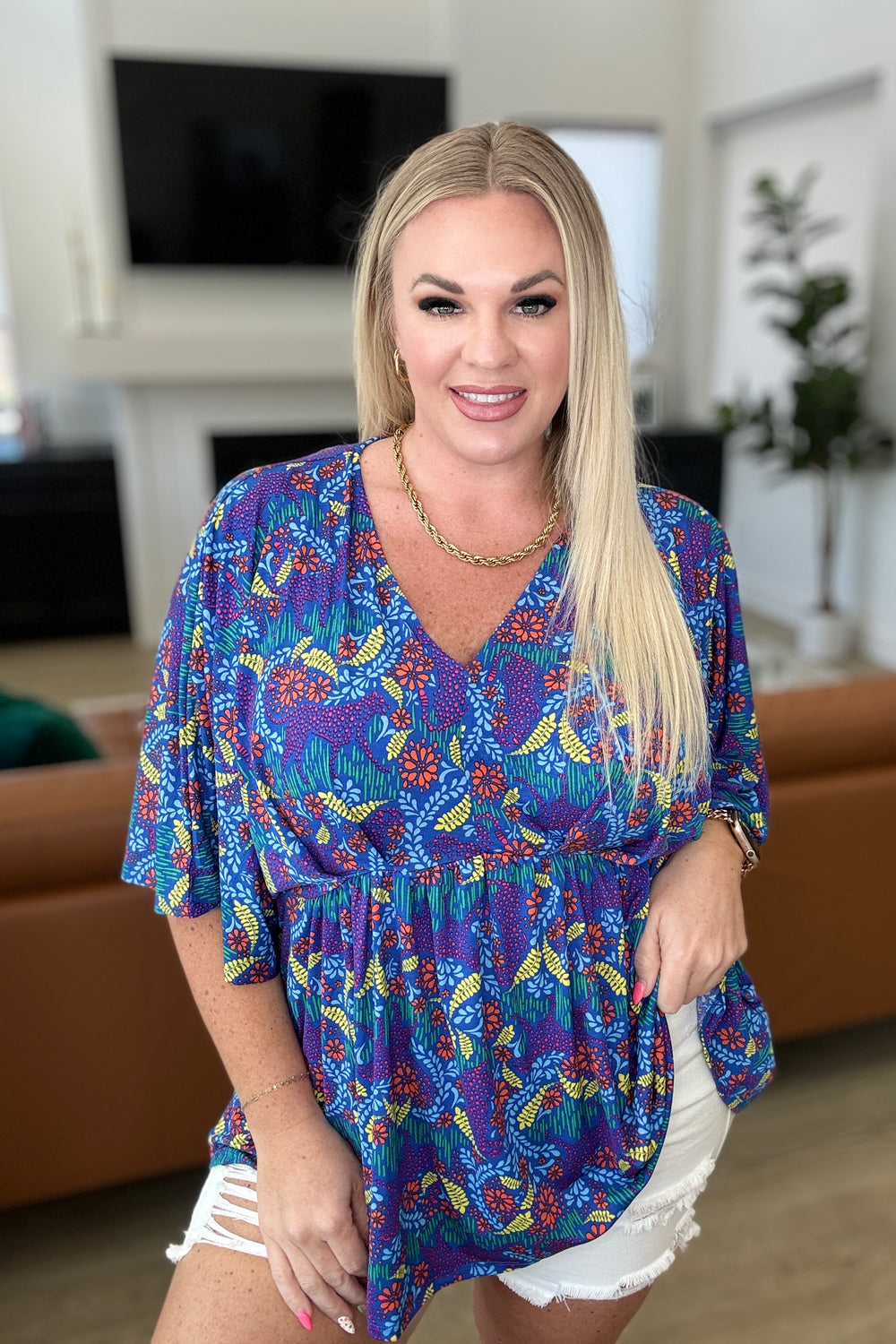 Pleat Front V-Neck Top in Royal Blue