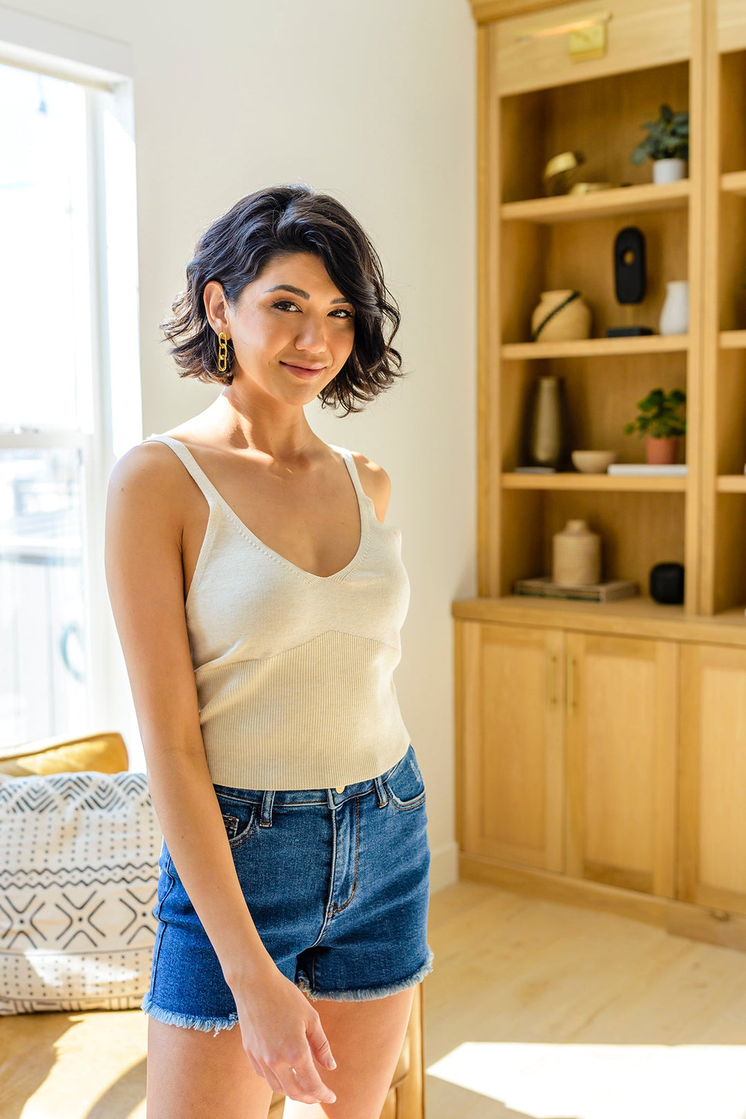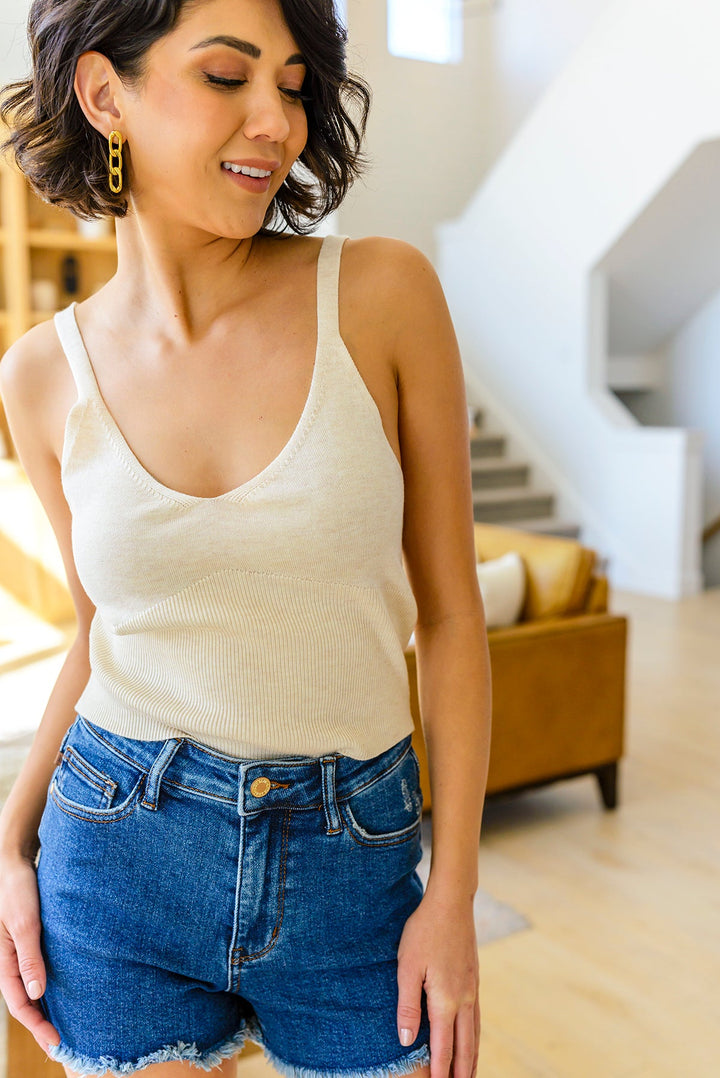 Get your summer wardrobe ready with the Best Part Tank In White! This lightweight knit tank features a v-neckline, spaghetti straps, ribbed bodice, and slightly cropped silhouette. We're obsessing over the fact that we can now wear knits year round! Pair this perfect tank with some wide leg jeans and sneakers for a casual & chic look!