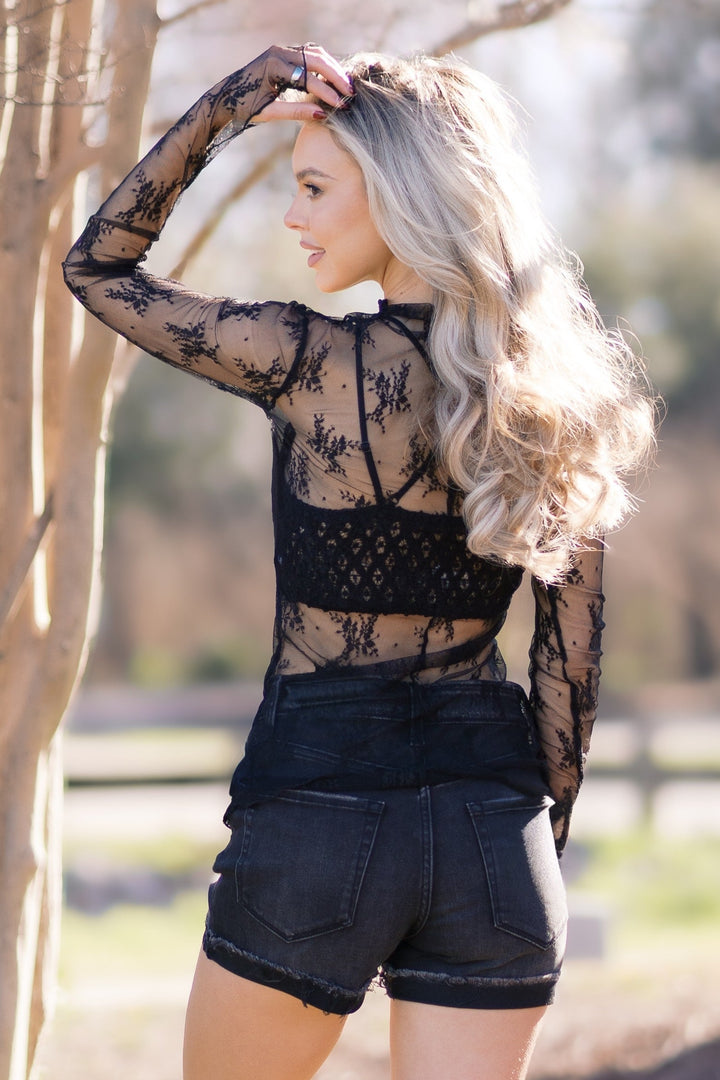 Wrap yourself in our Black Lace Embrace Top made of soft, lightweight lace mesh fabric. Its high neck design and slim fit will keep you stylish and comfortable. Perfect for any occasion, this top comes with long sleeves and doesn't include a lining (bralette not included). Get ready to embrace the lace!