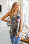 This Camouflage Flag Pocket Tank blends style and comfort in one. It features a scoop neckline and soft knit fabric for a comfortable fit. A bold camouflage pattern and flag print pocket on the front lends classic style.