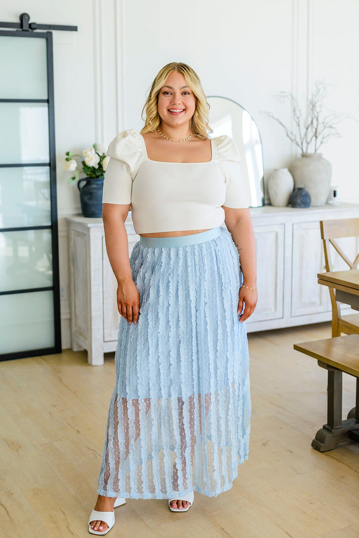 Take your wardrobe to the next level with this maxi-length A-line skirt! Featuring an elastic waistband and high-waisted fit, it's the perfect balance of comfort and style. The cascading ruffles and delicate swiss dot mesh overlay offer an extra stylish twist, sure to elevate any look. Let your style shine with this one-of-a-kind skirt!