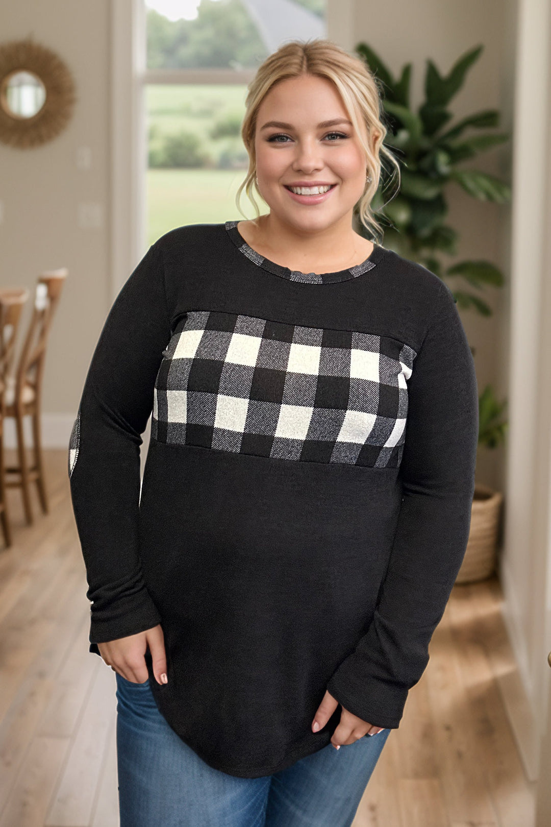 Get ready to conquer the fashion game with the Checkmate Pullover! Made from a cozy hacci sweater knit, this pullover features a round neckline, stylish plaid and black colorblock design, and playful elbow patches. Plus, the plaid trim on the neckline adds a playful touch. Checkmate your fashion opponents today!