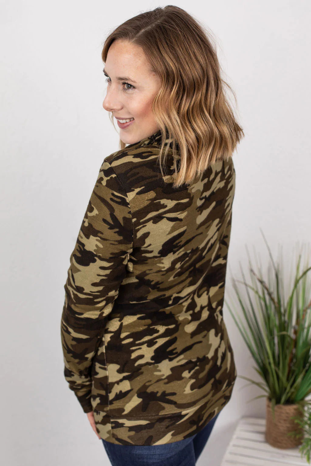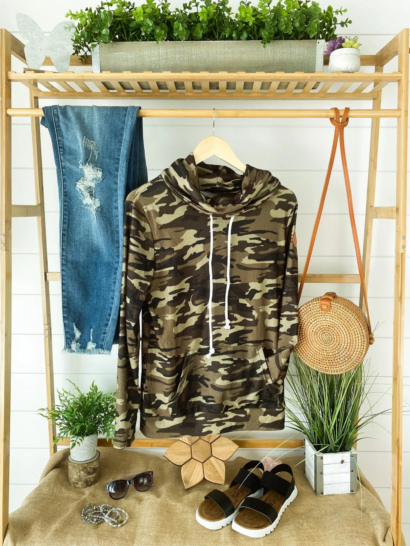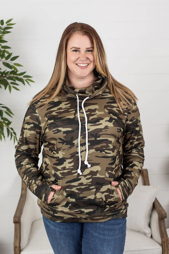 This fabric is super soft, and very stretchy like our triple stretch fabric, Great camo print for year-round wear, plus a cowl neck and front kangaroo pocket! And of course, thumbholes! Fabric on this one is lightweight and perfect for that spring transition and summer camping fun!