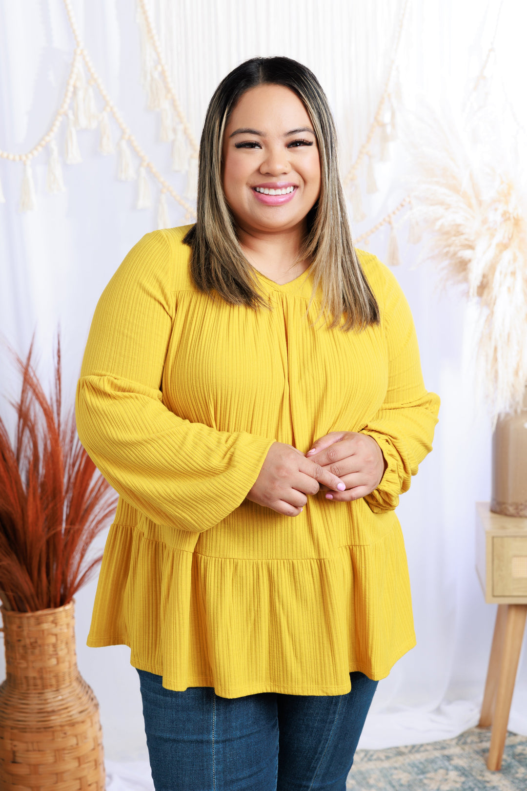 This mustard-colored long sleeve is the real deal! Tiered hem and bubble sleeves will keep you feeling cosy and looking cute. Everyone will be "yellow" with envy when they see you rocking this v-neck. Stylin' never felt so good!