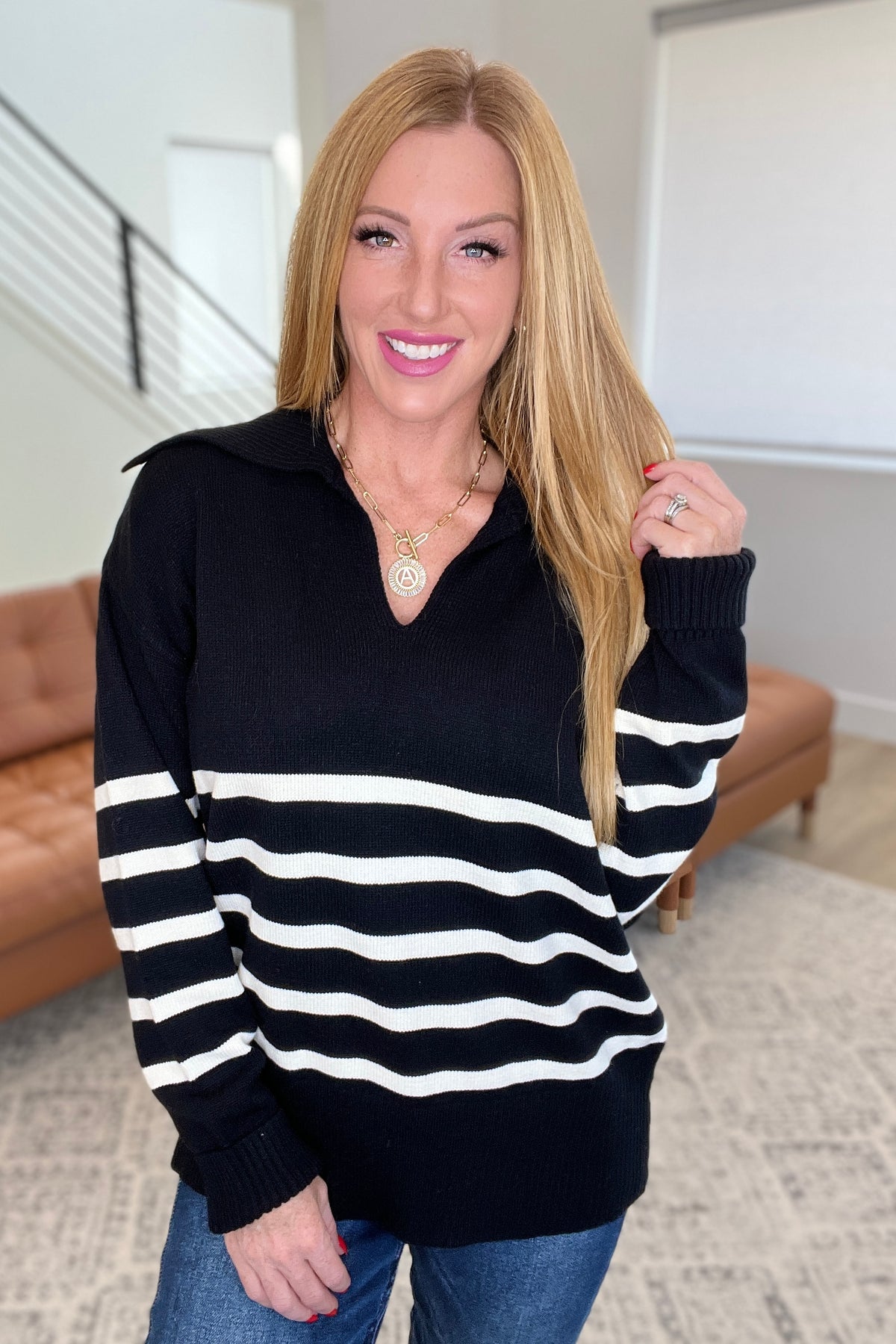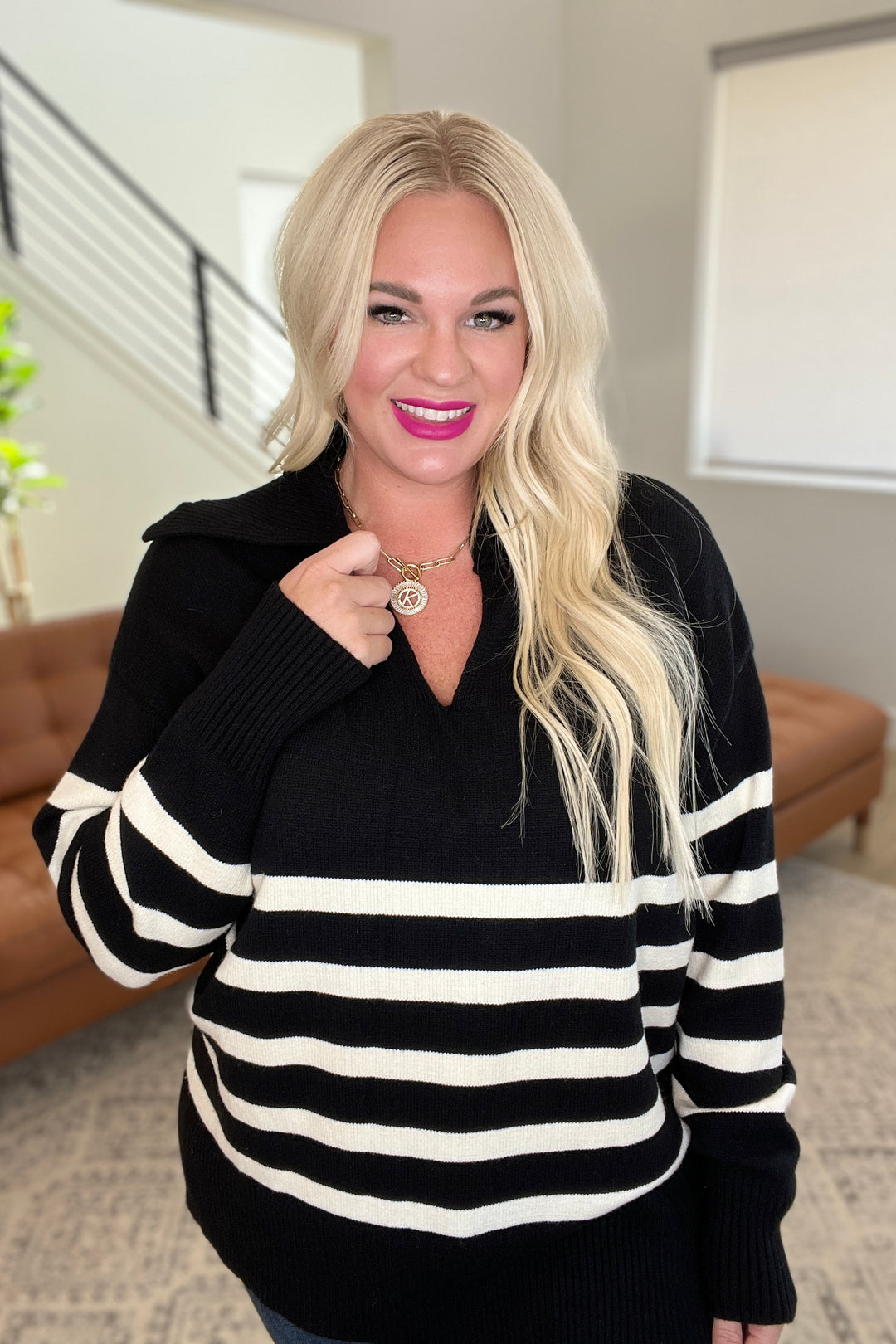 This From Here On Out Striped Sweater adds a bold statement to any wardrobe. It features a soft, sophisticated sweater knit, a collared v-neckline, and balloon sleeves with a relaxed fit. Enjoy the feel of the cozy material and the chicness of the bold stripes.