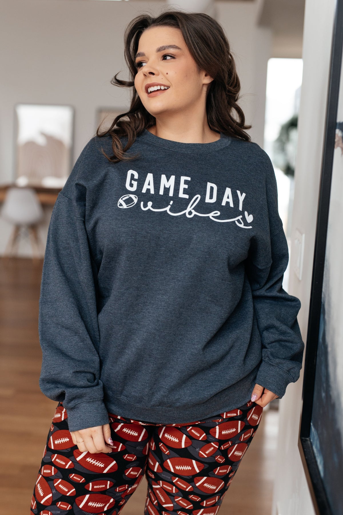 The Game Day Vibes Pullover - this soft charcoal pullover features a classic crew neck and long sleeves, ensuring warmth and comfort. The simple “game day vibes” graphic makes us think of kick-offs, couch cuddles, and snacks for all!