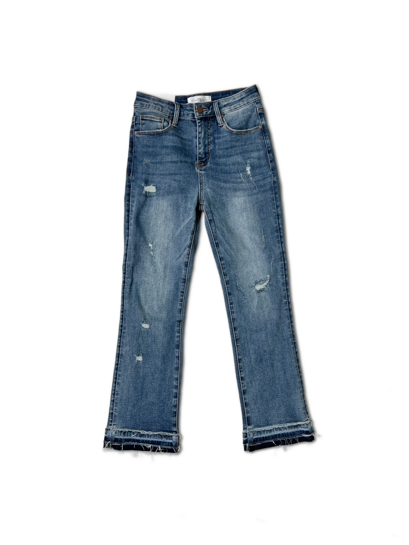 Get ready to step up your style game with our Risen Crops! These cropped jeans feature a flattering mid-rise fit and just the right amount of stretch for all-day comfort. With a trendy medium wash and subtle distressing, these jeans will take your outfits to the next level.
