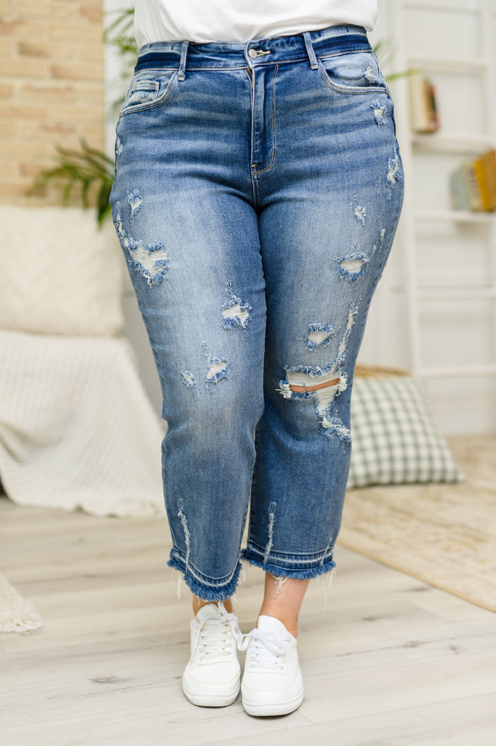 It's hard to come by the perfect pair of jeans but when the Harley Distressed Ankle Hem Jeans show up to your doorstep you'll instantly understand why they're perfect! Featuring a stretchy mid wash denim, shaping a hi-rise waist with a zipper fly and a five pocket cut. Fitted at the thighs, with worn-in fading and distressing throughout, these ankle length pant legs and at a slightly flared-raw hem.