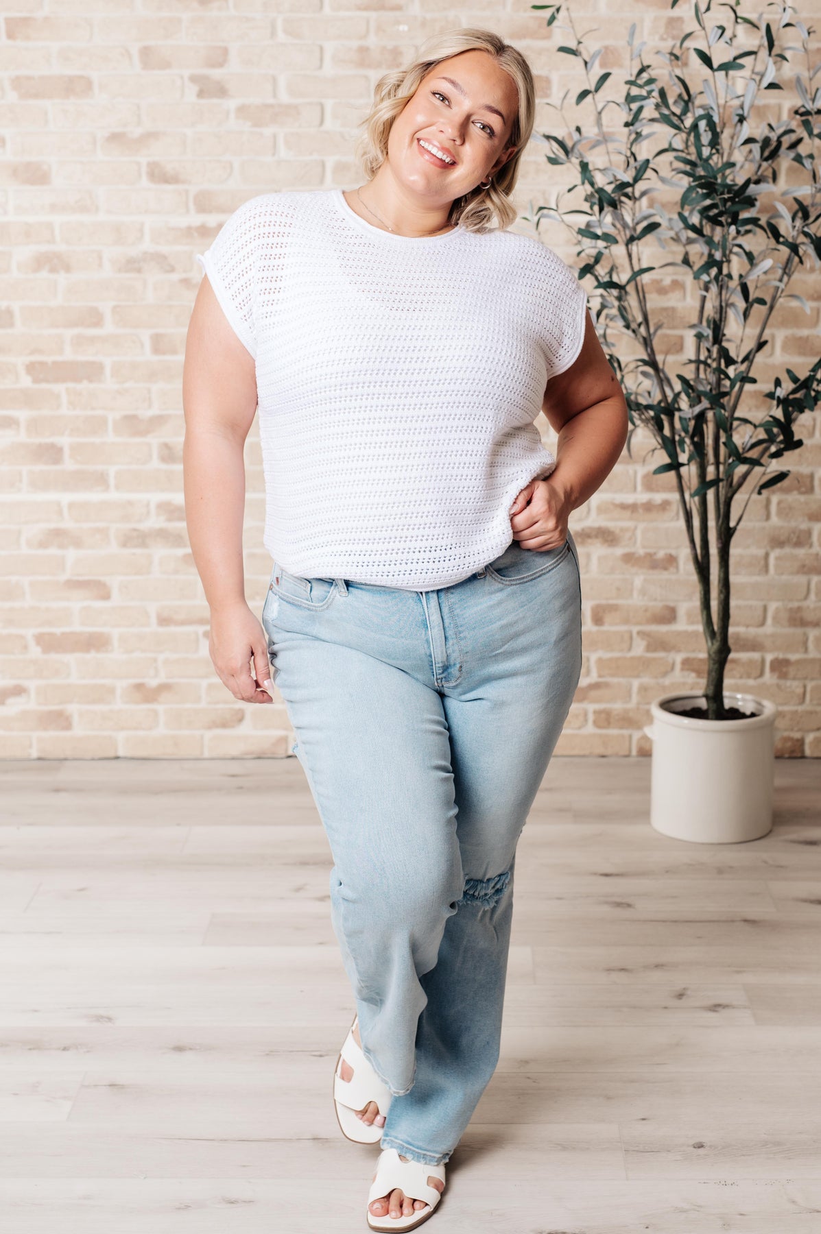The Here for More Open Knit Cap Sleeve Sweater is a must-have addition to your wardrobe! This lightweight sweater offers comfort and style, with a ribbed round neckline and dolman sleeves. The ribbed sleeve cuff adds a touch of uniqueness to this playful and fun top.
