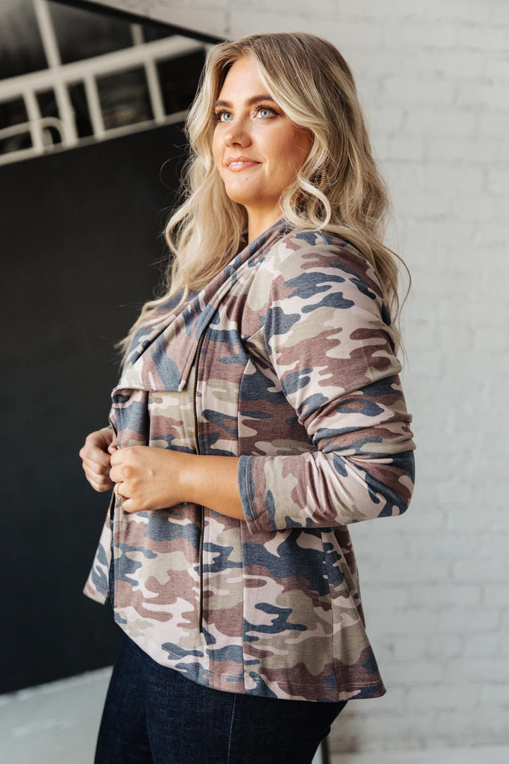 The Hideout Jacket is the layering piece you've been waiting for. This adorable camo jacket has a high-low hemline and looks amazing worn open with a layering top! When worn zipped up, this jacket has a form fitting silhouette with a fun collared detail. Pair this jacket with jeans or joggers.