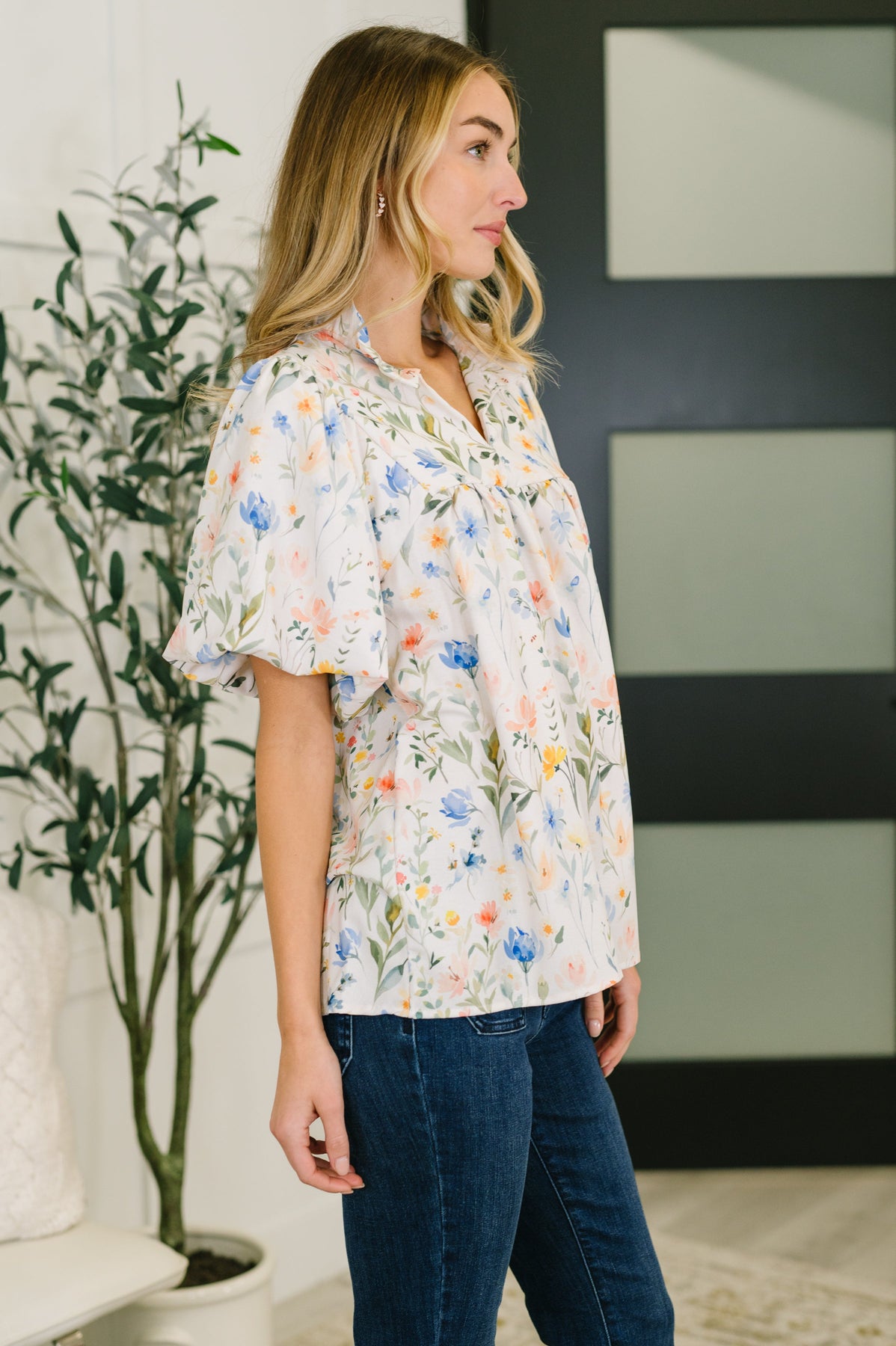 The In All This Time Notch Neck Floral Blouse is here to remind you that timeless style never goes out of fashion. Crafted in crisp poplin, this charmer boasts a notch neckline with high ruffled details that frame your face beautifully. Dreamy balloon sleeves bring movement and personality, while lined sleeves keep things comfortable against your skin. The cased elastic cuff ensures a perfect fit that stays put, so you can focus on looking fabulous without any fuss.