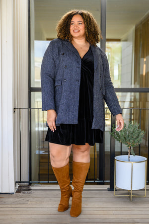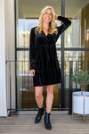 Enter the room in style in the Jentsyn Velvet V-Neck Dress In Black! Soft, luxe velvet shapes this gorgeous dress that features a flirty surplice neckline, framed by long sleeves. A fitted elasticated waist tops a flowy A-line skirt that falls to a ruffle hem.