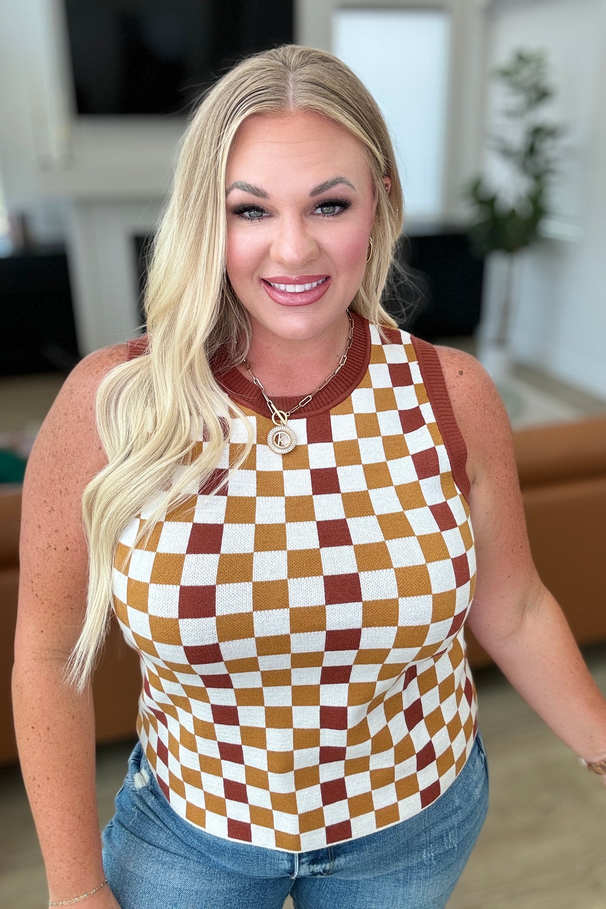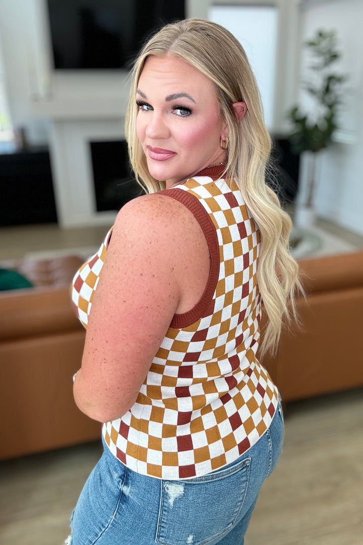 Achieve effortless style and comfort with our Keeping Score Checkered Tank, a versatile essential crafted from cozy sweater knit. The banded ribbed round neckline offers a classic and flattering silhouette, enhancing your neckline with understated elegance. Perfect for layering or wearing on its own, this tank top is designed for high-stretch comfort, providing a snug fit that moves with you throughout the day.