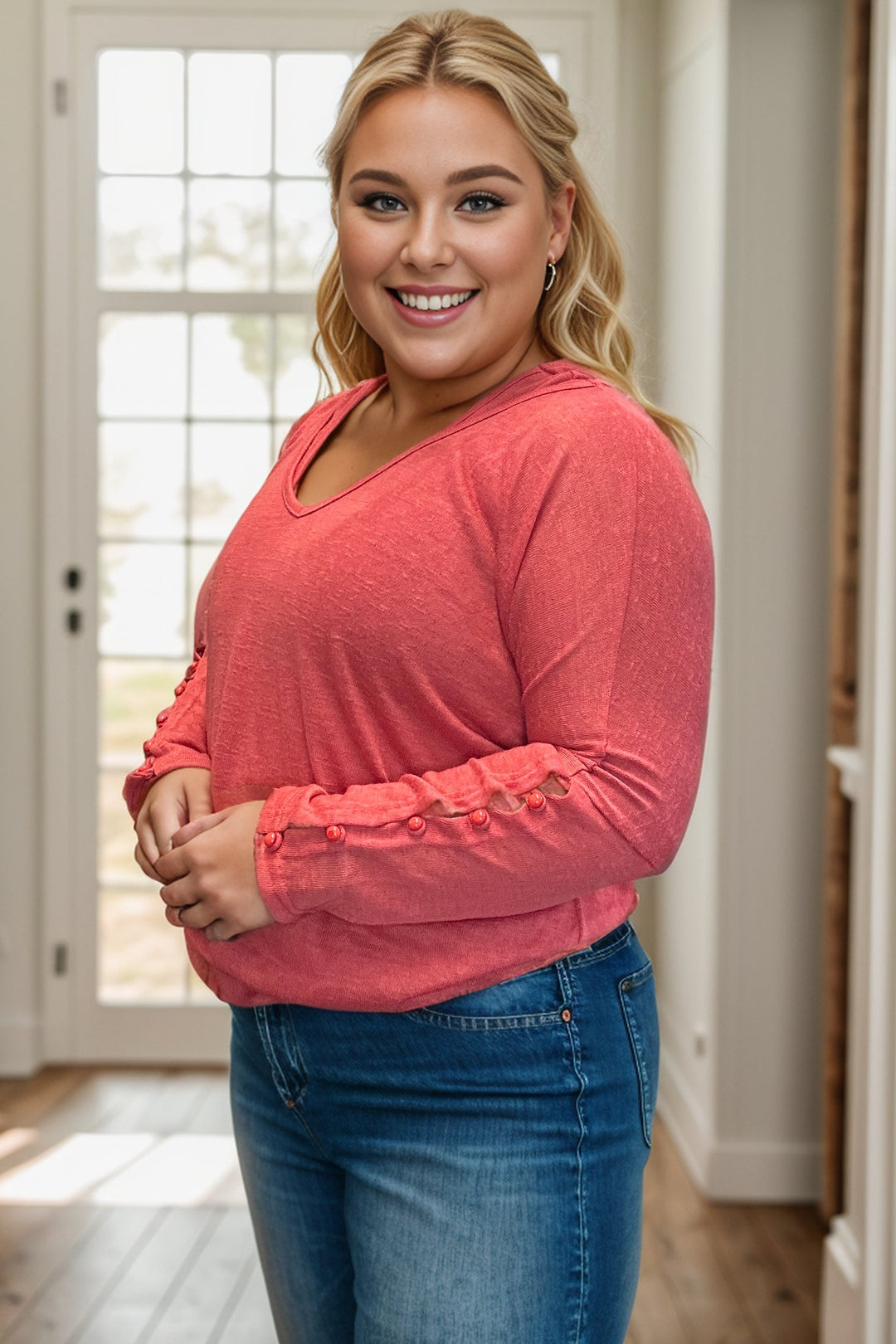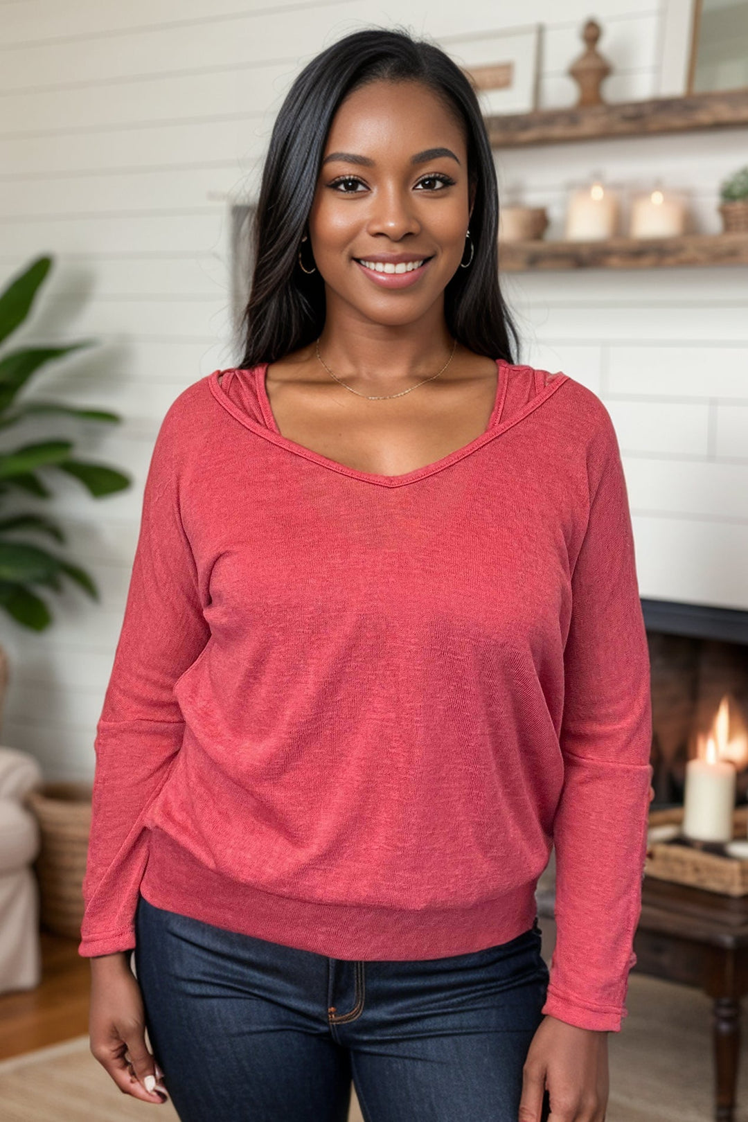 This playful pullover, "Love To Love Me," boasts a trendy layered look with a built-in under tank. The v-neck and long sleeves with five button cuffs add a touch of sophistication, while the banded hem keeps it casual. Perfect for those who don't take themselves too seriously.
