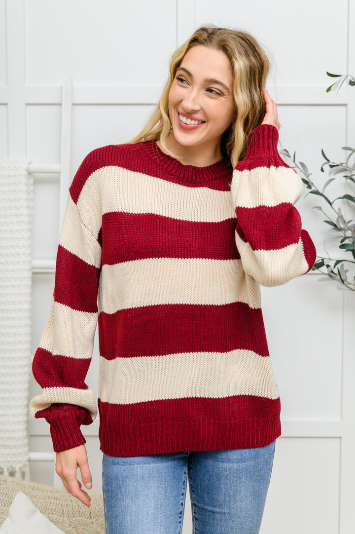 The Lucky Strike Top In Black Stripe features a medium-weight knit that shapes a round neckline with a drop shoulder detail and long sleeves. A burgundy and cream striped design lines the entire sweater.