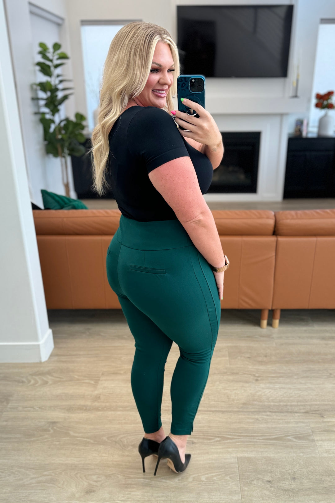 Achieve effortless style and comfort with our Magic Skinny Pants in Hunter Green! These high rise pants feature a slim fit and ponte knit for a flattering silhouette. A pull-on design offers convenience while the tuxedo stripe and faux welt pockets add a touch of sophistication.