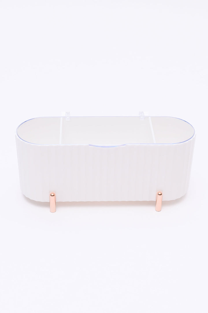 Meet our Mini Beauty Organizer in White, your compact solution to clutter-free beauty. This oblong-shaped container, adorned with dainty gold legs and a crystal-clear lid, brings a touch of sophistication to your vanity. With three spacious compartments, it gracefully houses makeup sponges, hair ties, cotton rounds, Q-tips, and other small beauty essentials, tidying up your countertop with style. The subtle ridges on the sides add a tactile charm, while the clear lid keeps your necesities dust-free. Practical, chic, and oh-so-versatile, it's your key to a perfectly organized beauty space.