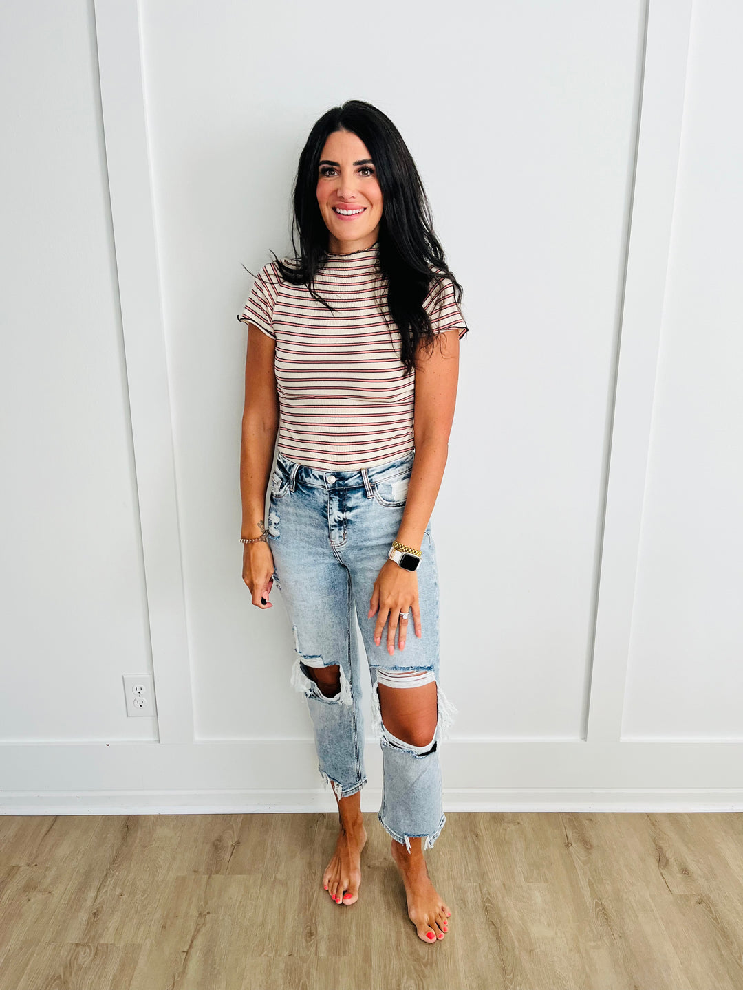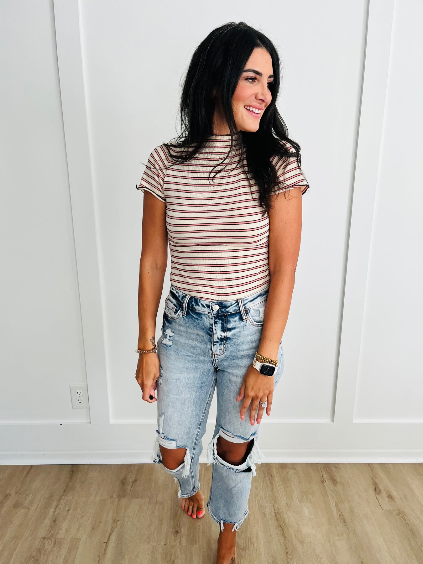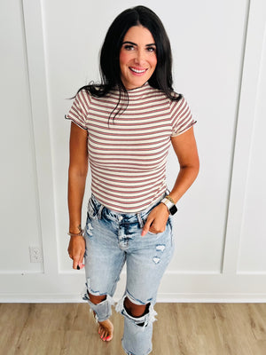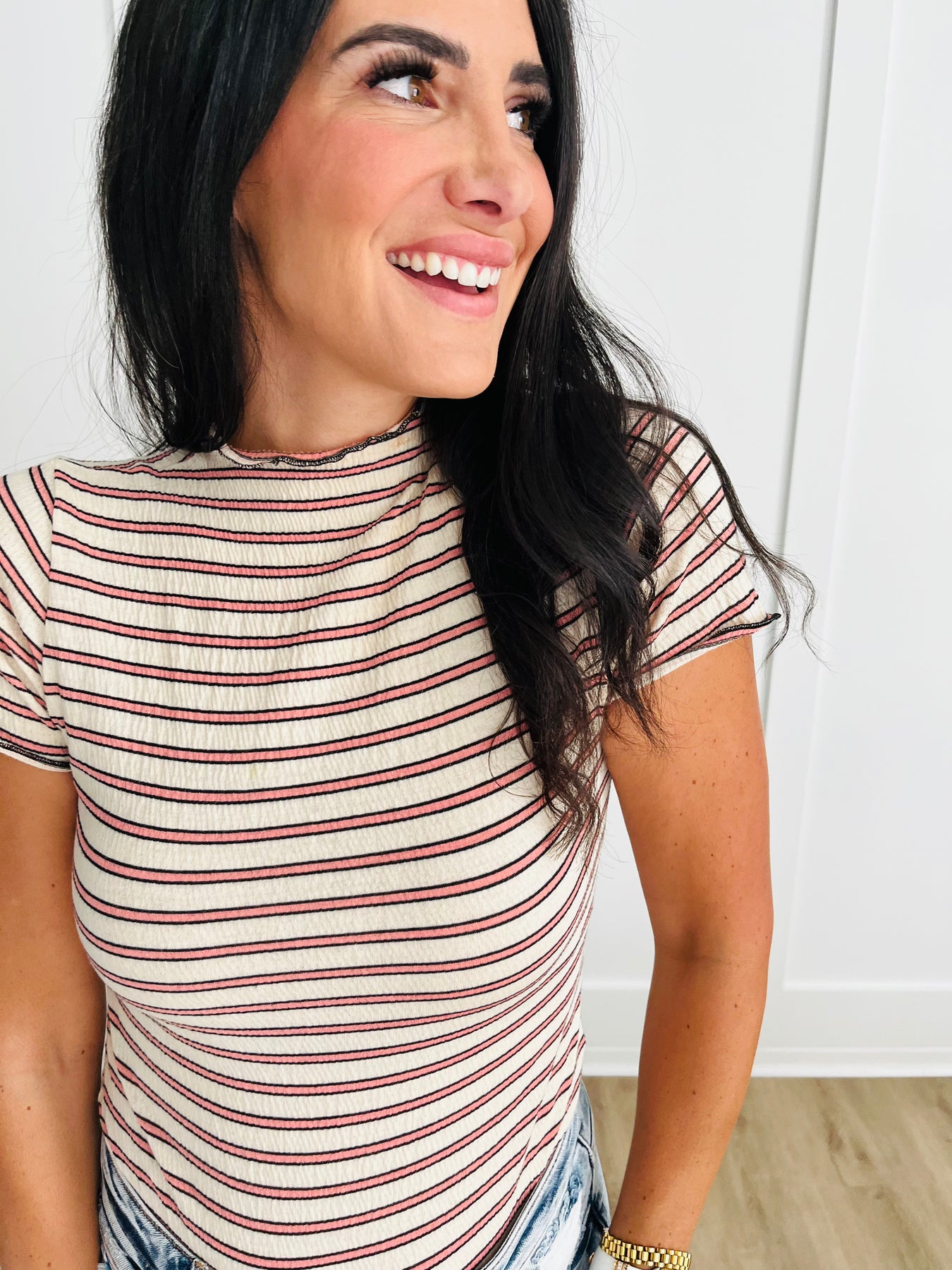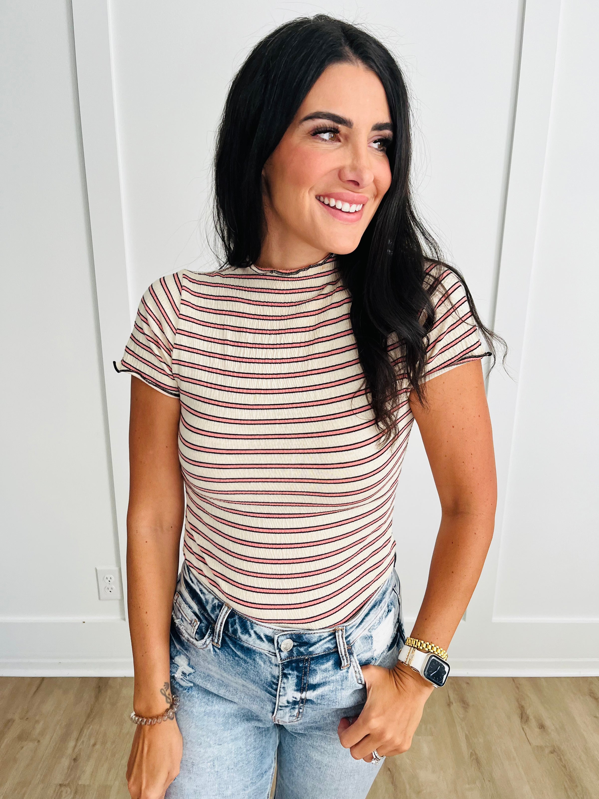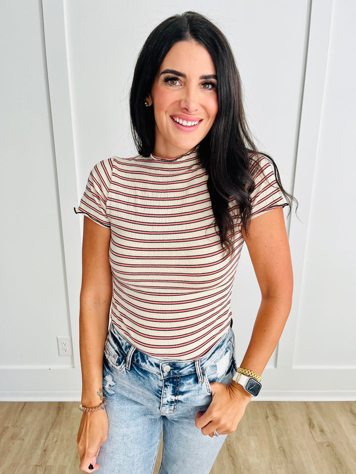 Look and feel classic and timeless in our Nostalgic Note Striped Mock Neck Top! Crafted from a textured knit, this top features a mock neckline, short sleeves, and a fitted silhouette to flatter your figure. The classic stripe pattern brings a touch of nostalgia to your outfit!