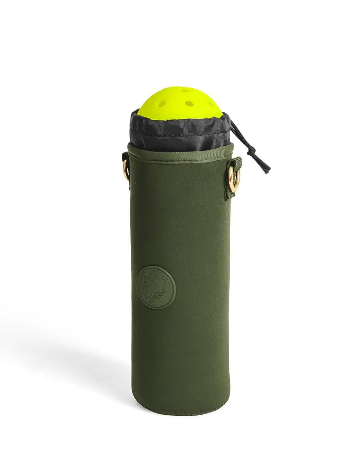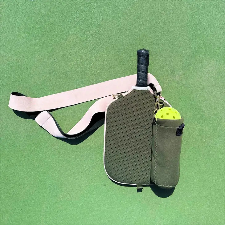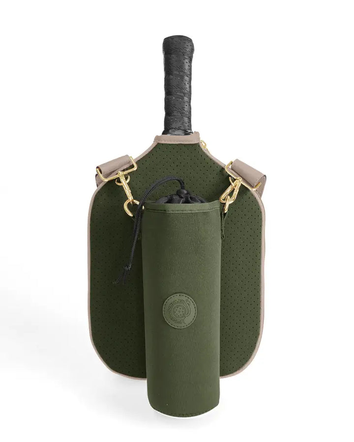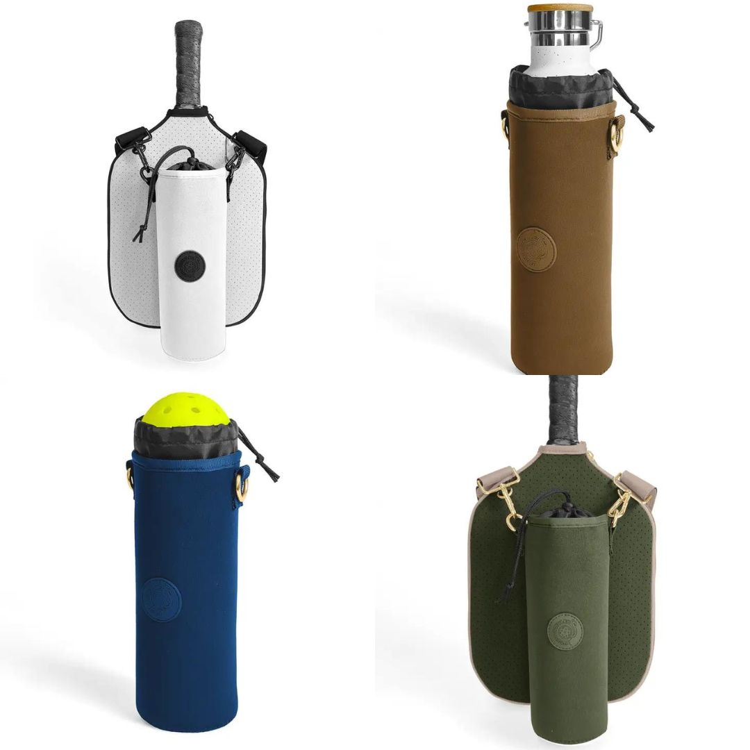 The perfect add-on to our crossbody pickleball paddle cover! Storage for up to three pickleballs or an 18 oz waterbottle. Crafted from high-quality, weather-resistant, durable neoprene. Available in white, navy, green and brown.