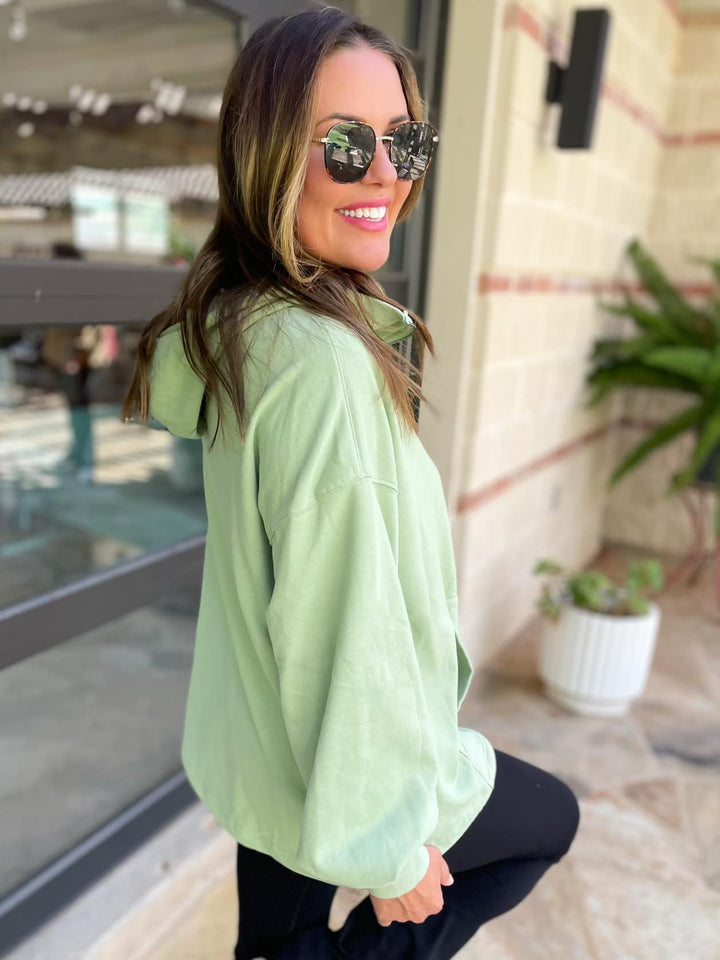 This oversized half zip hoodie will be on repeat all year long! The lighter weight makes it a versatile transition piece through any season and the relaxed fit keeps you feeling comfy with denim or leggings. Featuring a half zipper, adjustable cinch waist, kangaroo pocket, a drop shoulder design and oversized hood.