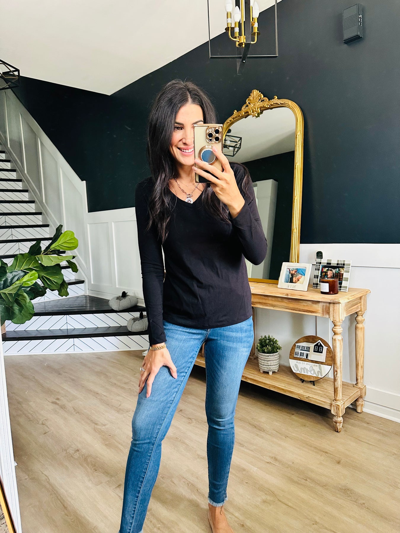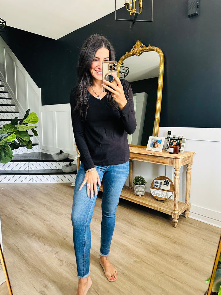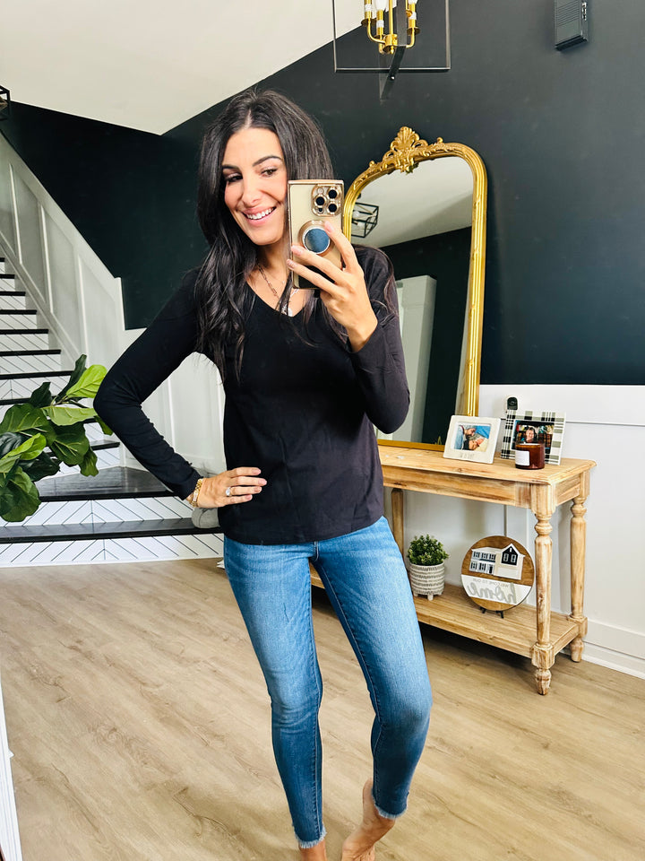 Our Relaxed Fit Long Sleeve V-Neck Top in Black is perfect for any occasion. Crafted with a cotton blend fabric for superior comfort and breathability, this top features a V-neckline and long slim sleeves. Experience an ideal fit that is both comfortable and stylish.