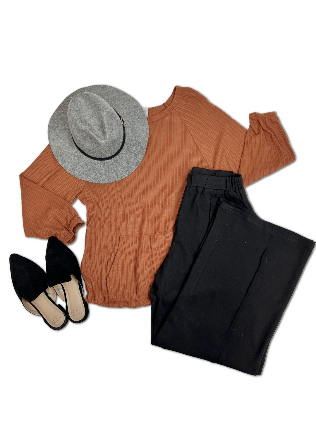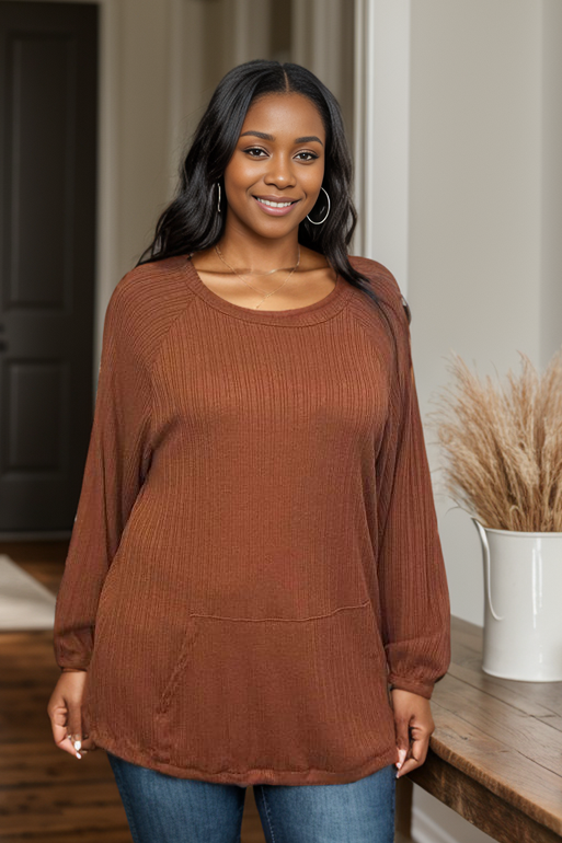 Get cozy and stylish in our Rustico Pullover! With a round neckline and textured fabric, this pullover is both soft and on-trend. The long sleeves and self tie hem make for a relaxed fit, all in a bold rust color that will surely make a statement.