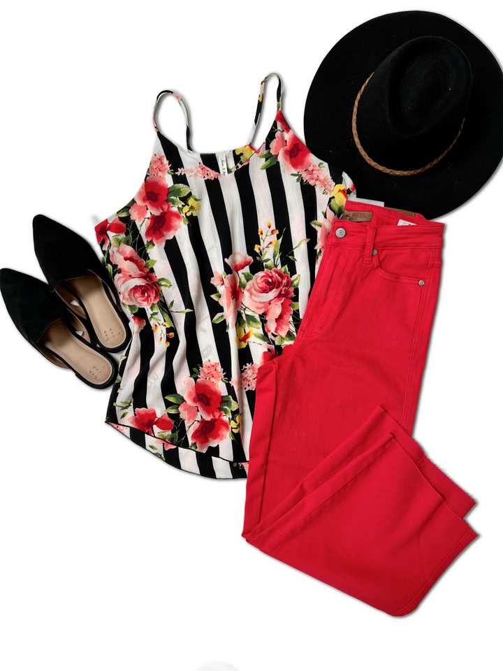 Introducing Scarlette Rose's Judy Blue Tummy Control Crops - high waisted with a tummy control panel for a flattering fit. These crops feature great stretch for all-day comfort and a wide crop leg with a raw hem for a trendy twist. Available in striking red.