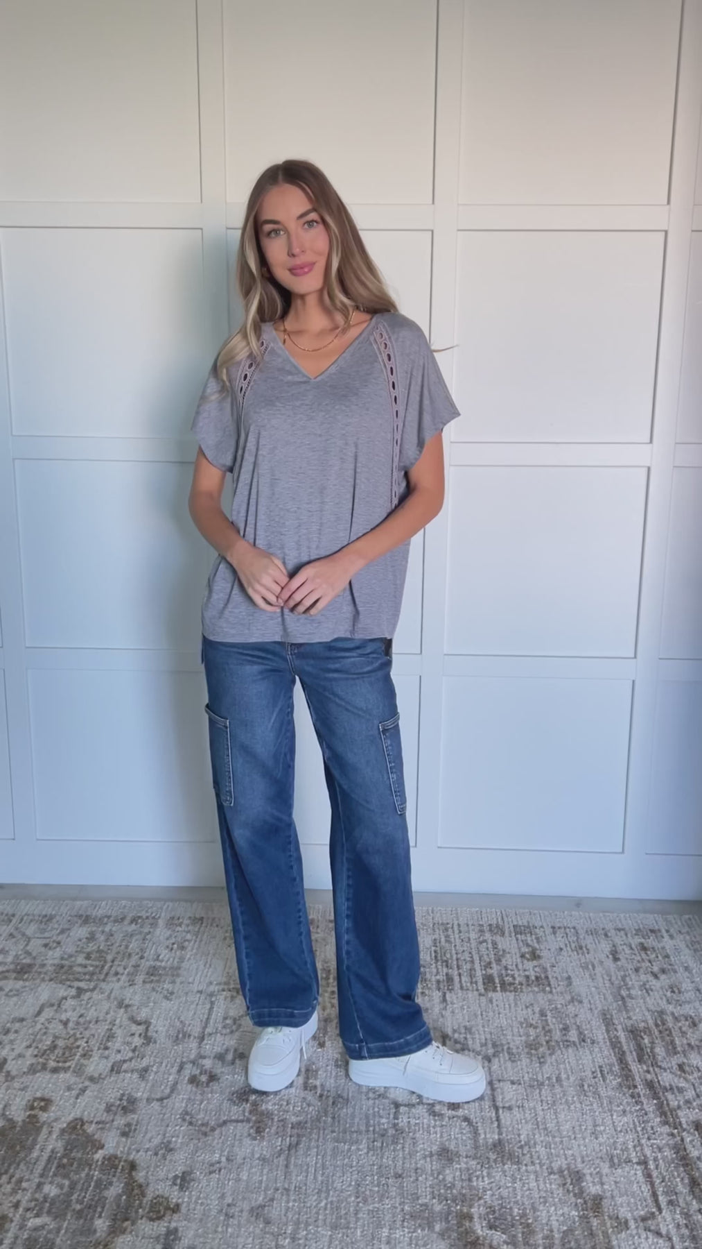Be chill and stylish with our Take it Easy Eyelet Trim Top. Made from lightweight jersey knit, it's perfect for any casual day out. The V-neckline and batwing sleeves provide a relaxed fit, while the eyelet trim adds a touch of unique detail. Finished with a stepped hemline for added flair.