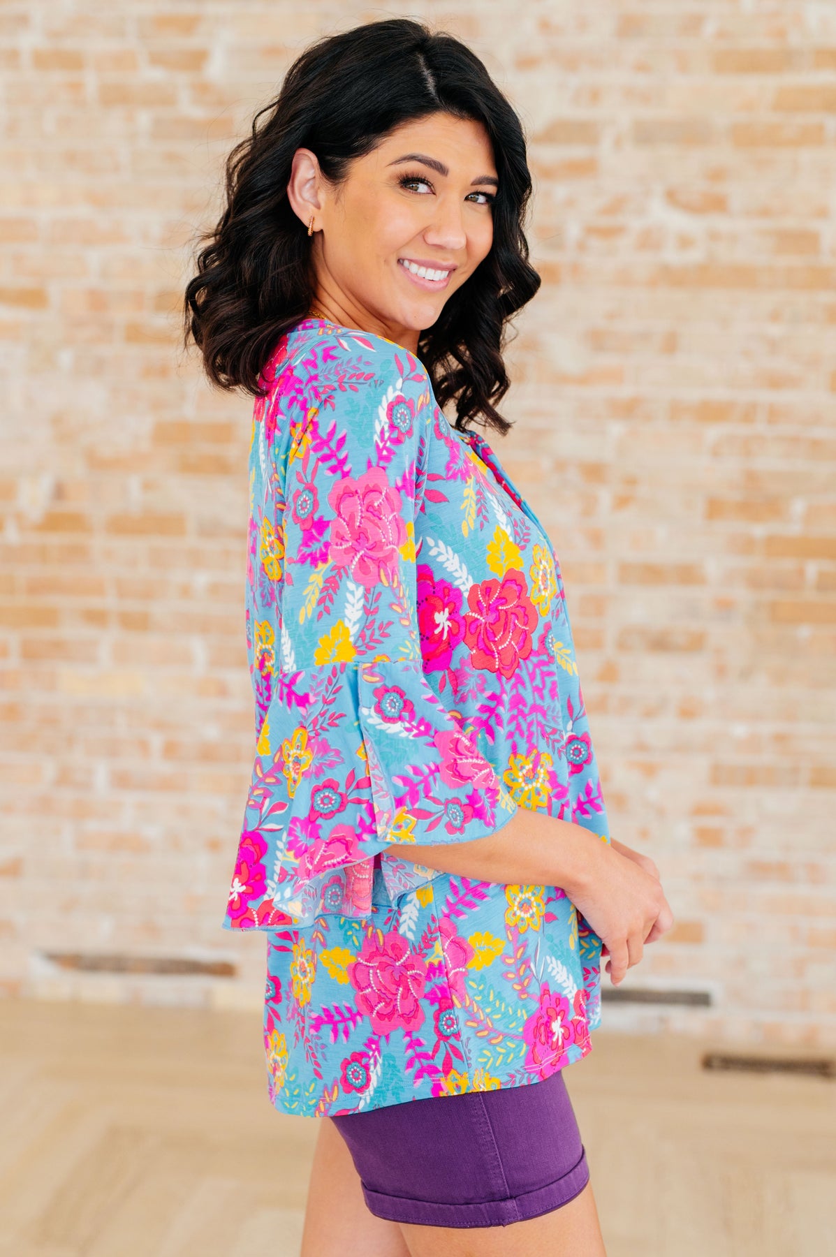 Add some boho vibes to your wardrobe with our Willow Bell Sleeve Top! Made with Bulgari fabric, this top features a flattering v-neck, a functional tie, and beautiful bell sleeves with a slit. Perfect for adding a touch of whimsy to any outfit.