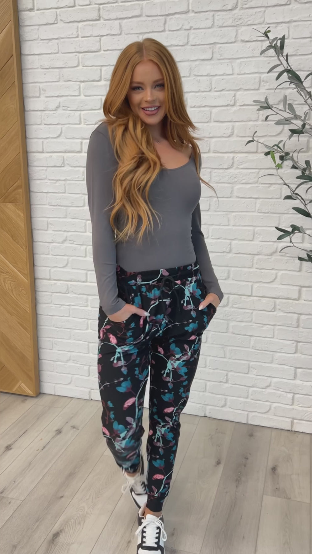 Your New Favorite Joggers are crafted from buttery soft fabric and have an elastic waistband with an adjustable drawstring for a comfortable fit. The unique luminescent vine pattern and tapered jogger silhouette make them the perfect choice to match up with our cozy sweatshirts or graphic tees this season!